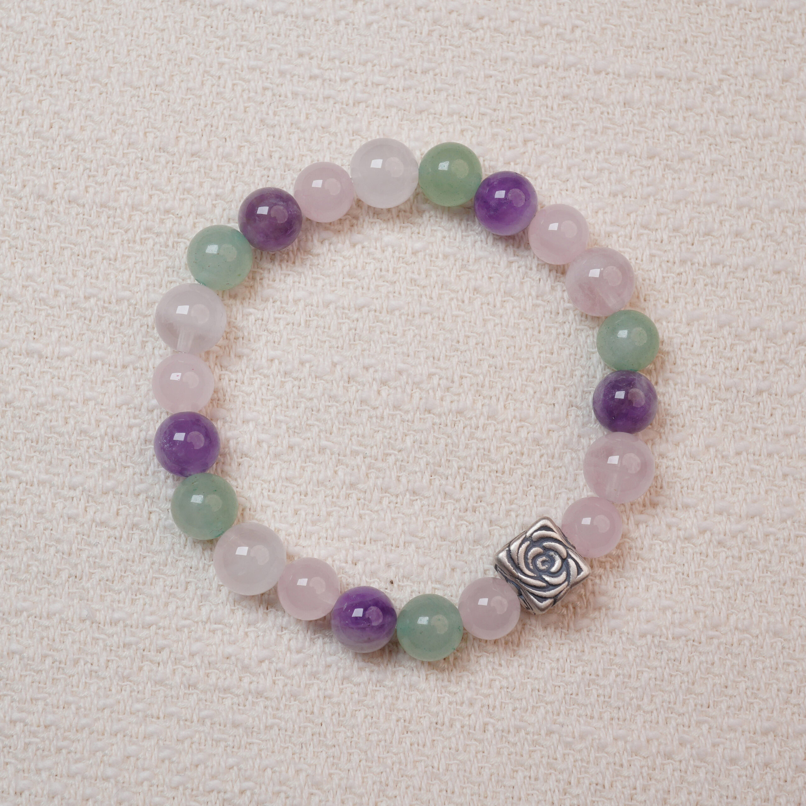 This gentle and vibrant multi gemstone bracelet features rose quartz for love, amethyst for calm, and green aventurine for luck—perfect for emotional healing and everyday beauty.