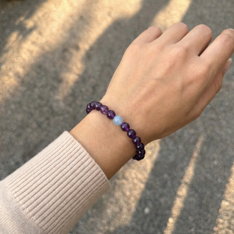 Love how this bracelet looks in natural light. The deep purple beads are beautiful, and the light blue stone in the center really stands out in a subtle way. I took this photo while walking outside, and it honestly feels very calming to wear. It’s lightweight, comfortable, and doesn’t feel bulky at all. I’ve been wearing it daily, and it goes perfectly with cozy sweaters and neutral outfits.