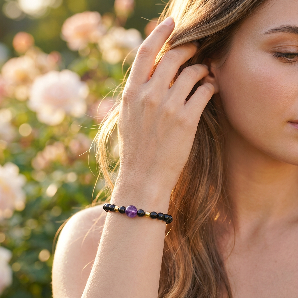 Amethyst and black tourmaline come together in this elegant gold-beaded bracelet, offering spiritual clarity, protection from negativity, and grounding energy in a refined and wearable design.