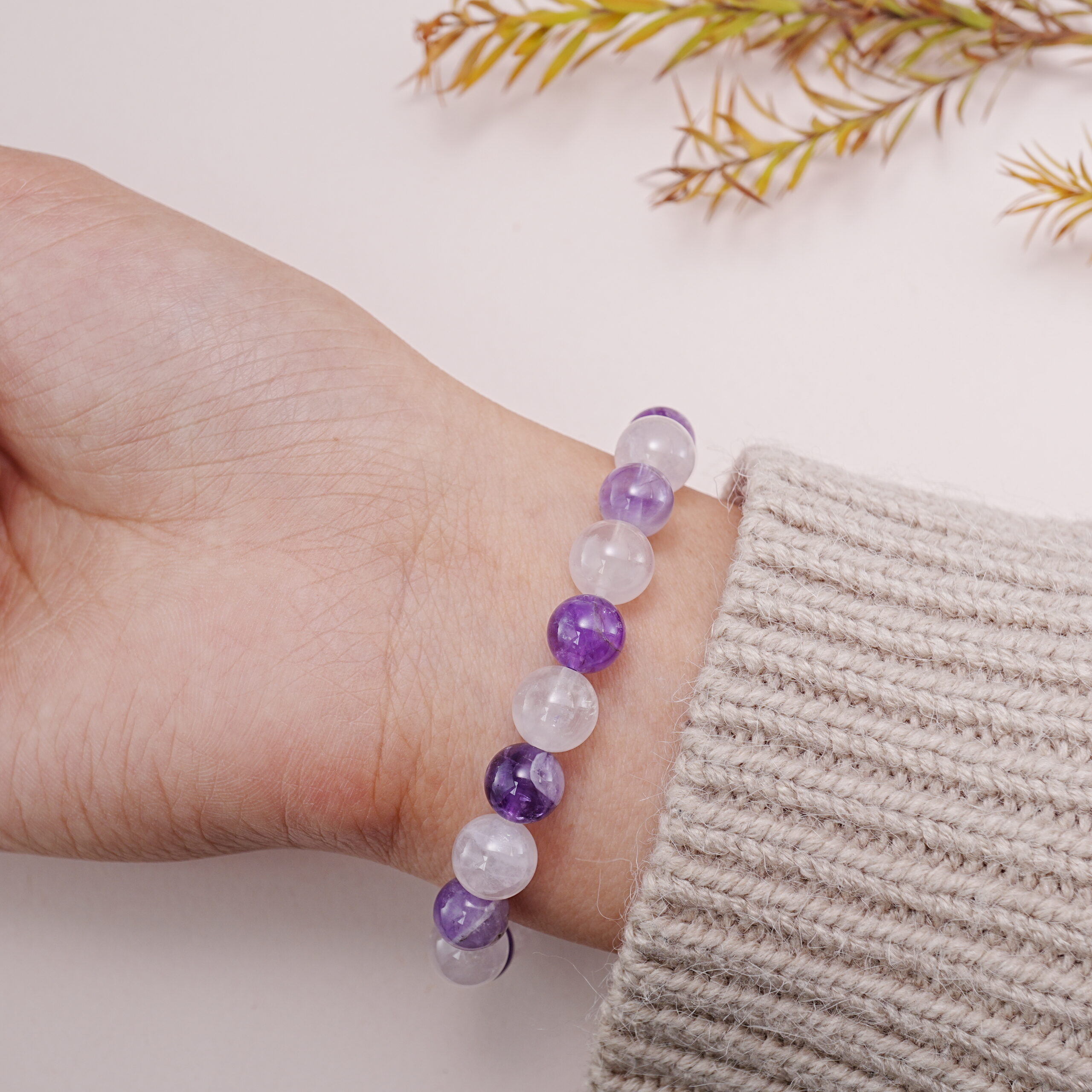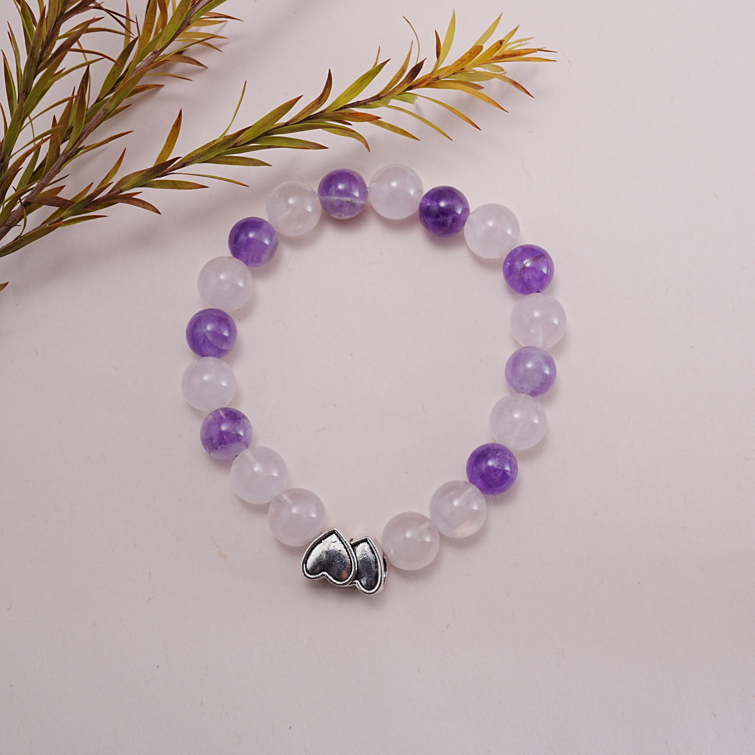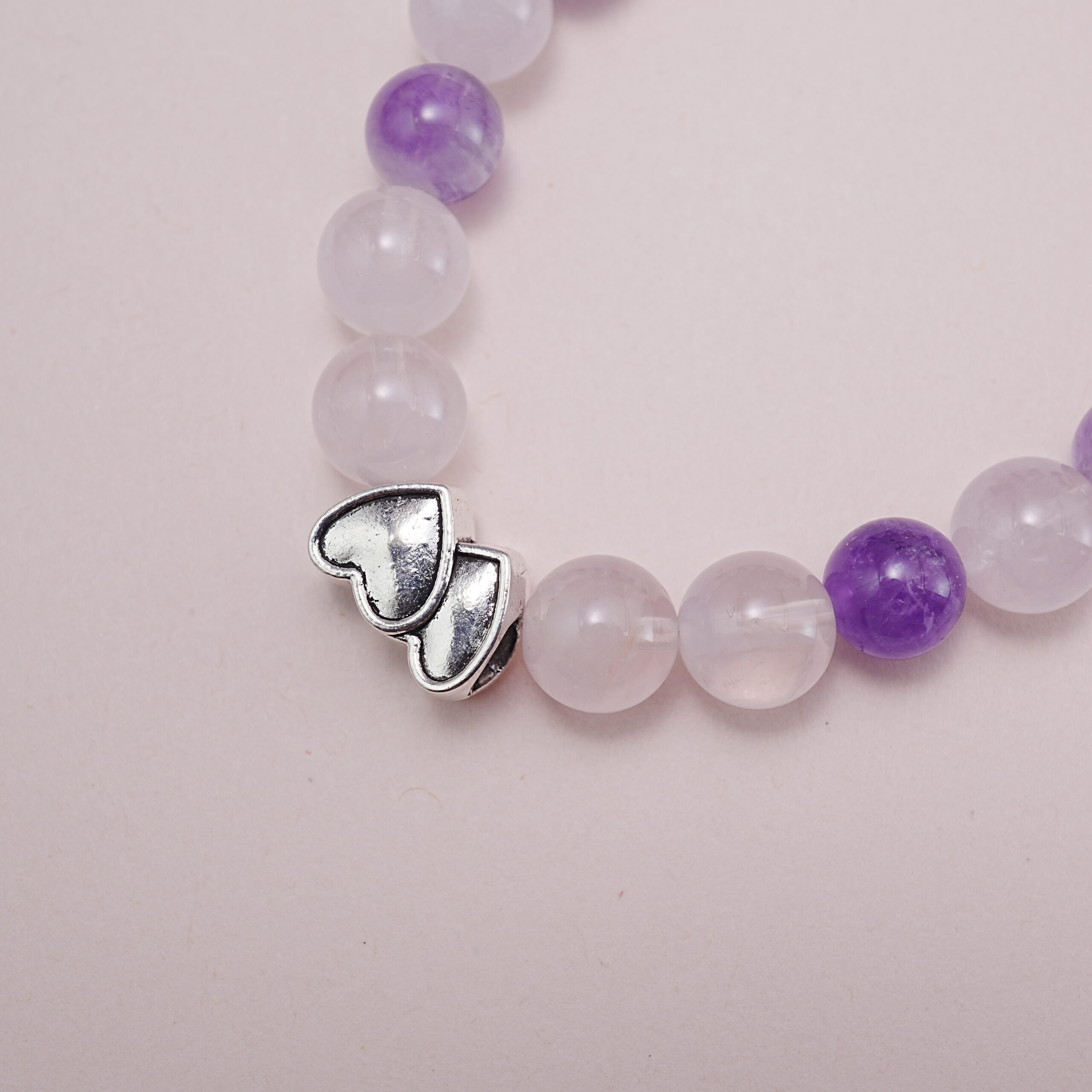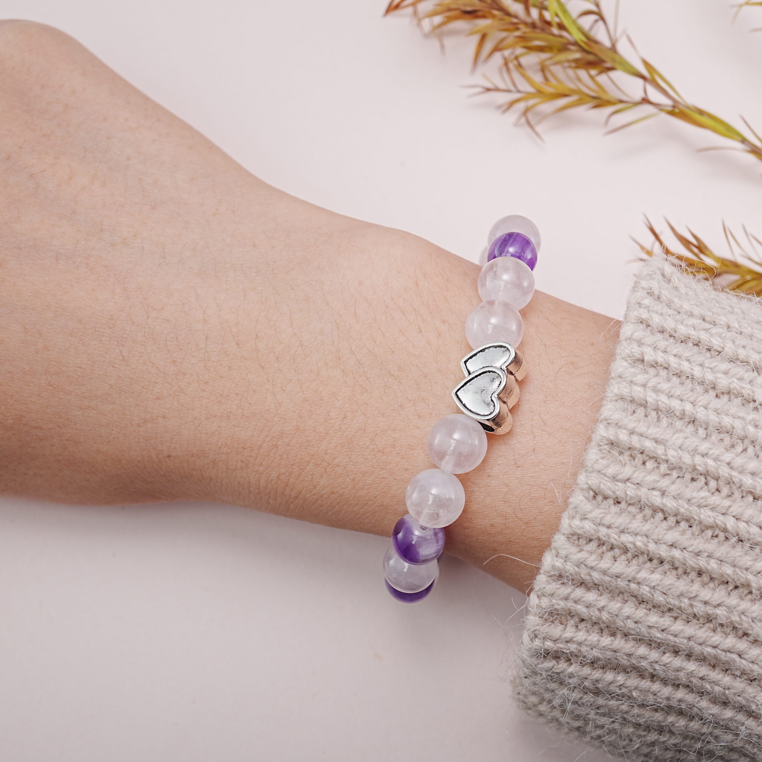 A heartfelt blend of amethyst and rose quartz with a silver double heart charm, this gemstone bracelet inspires love, compassion, and emotional healing while encouraging trust, comfort, and peace in your everyday life.
