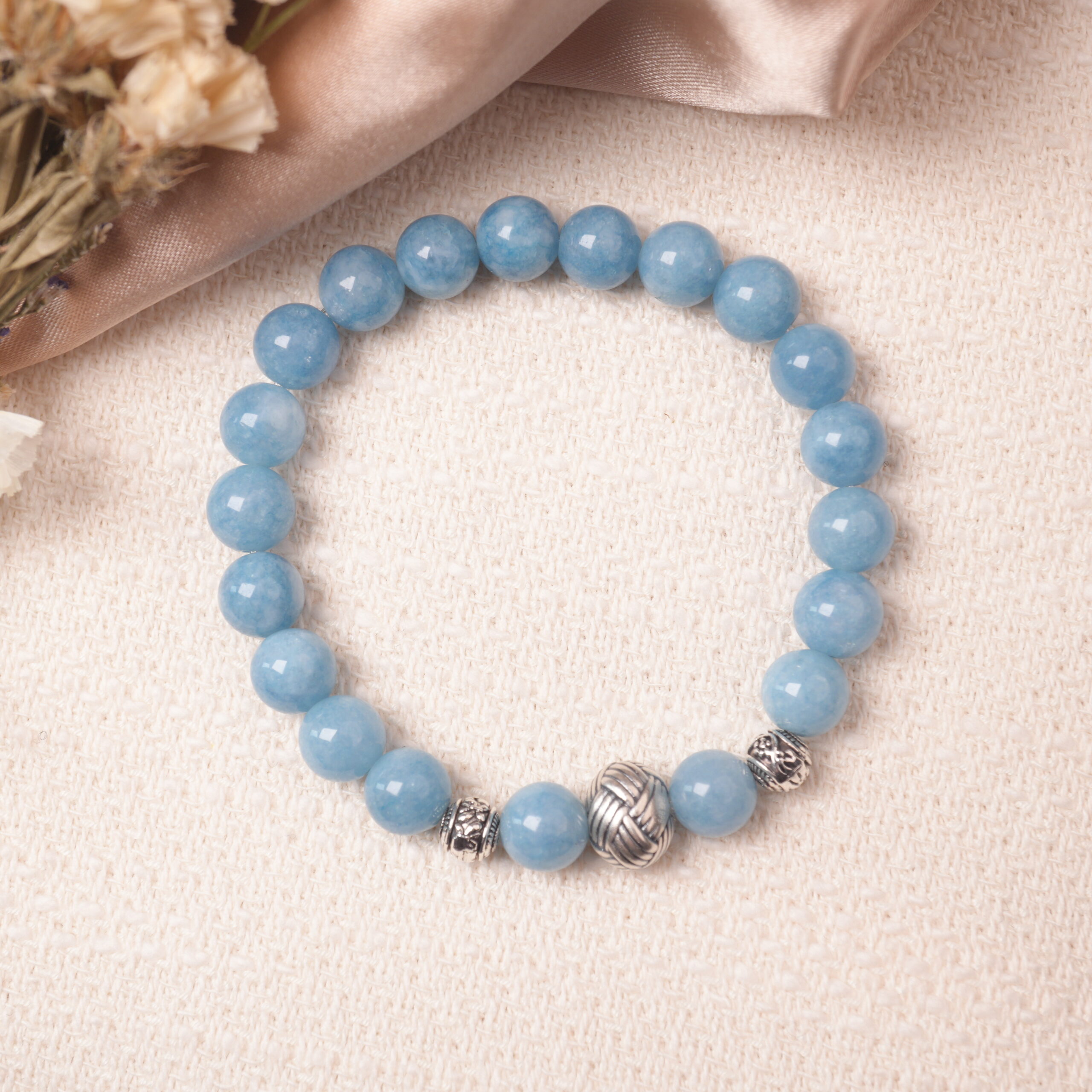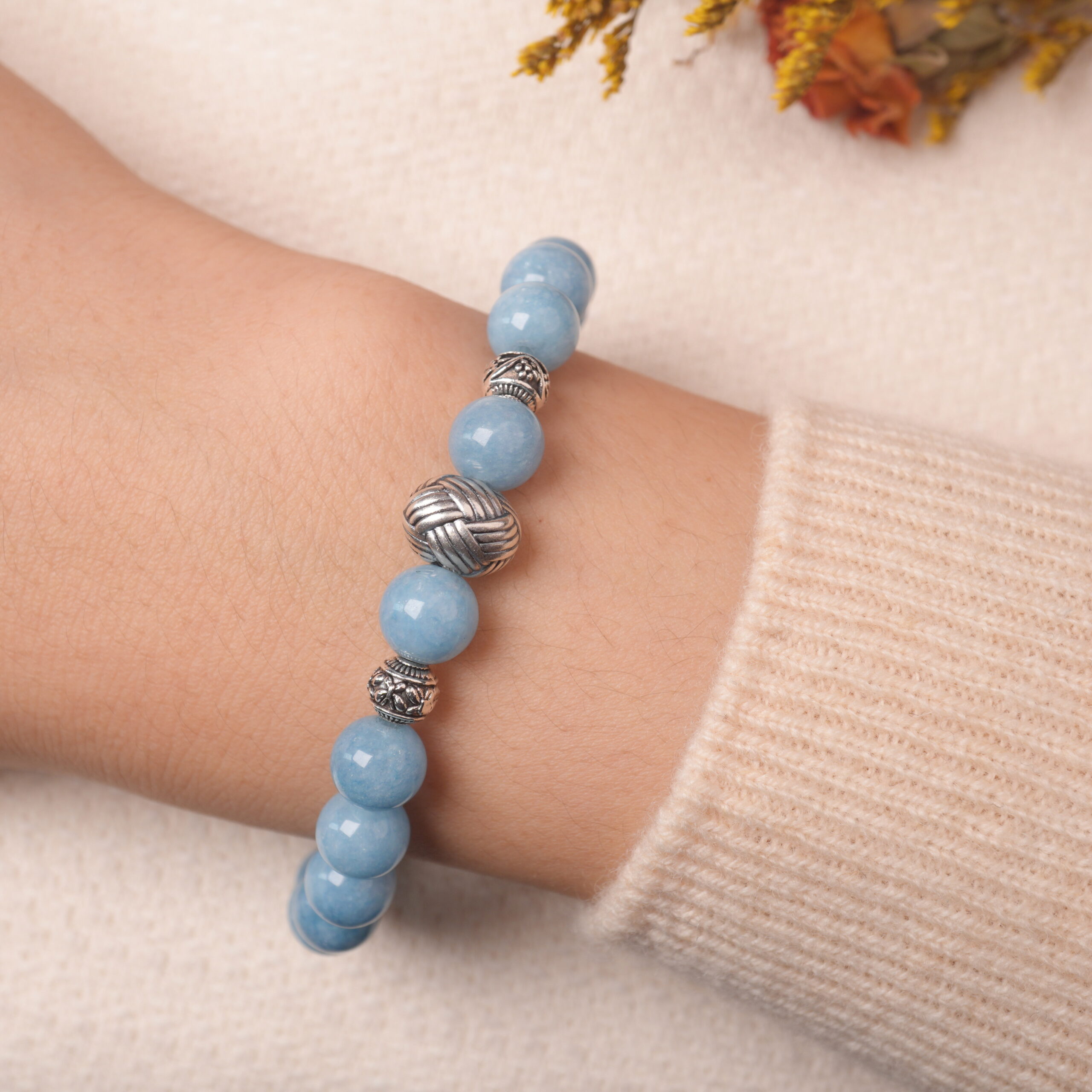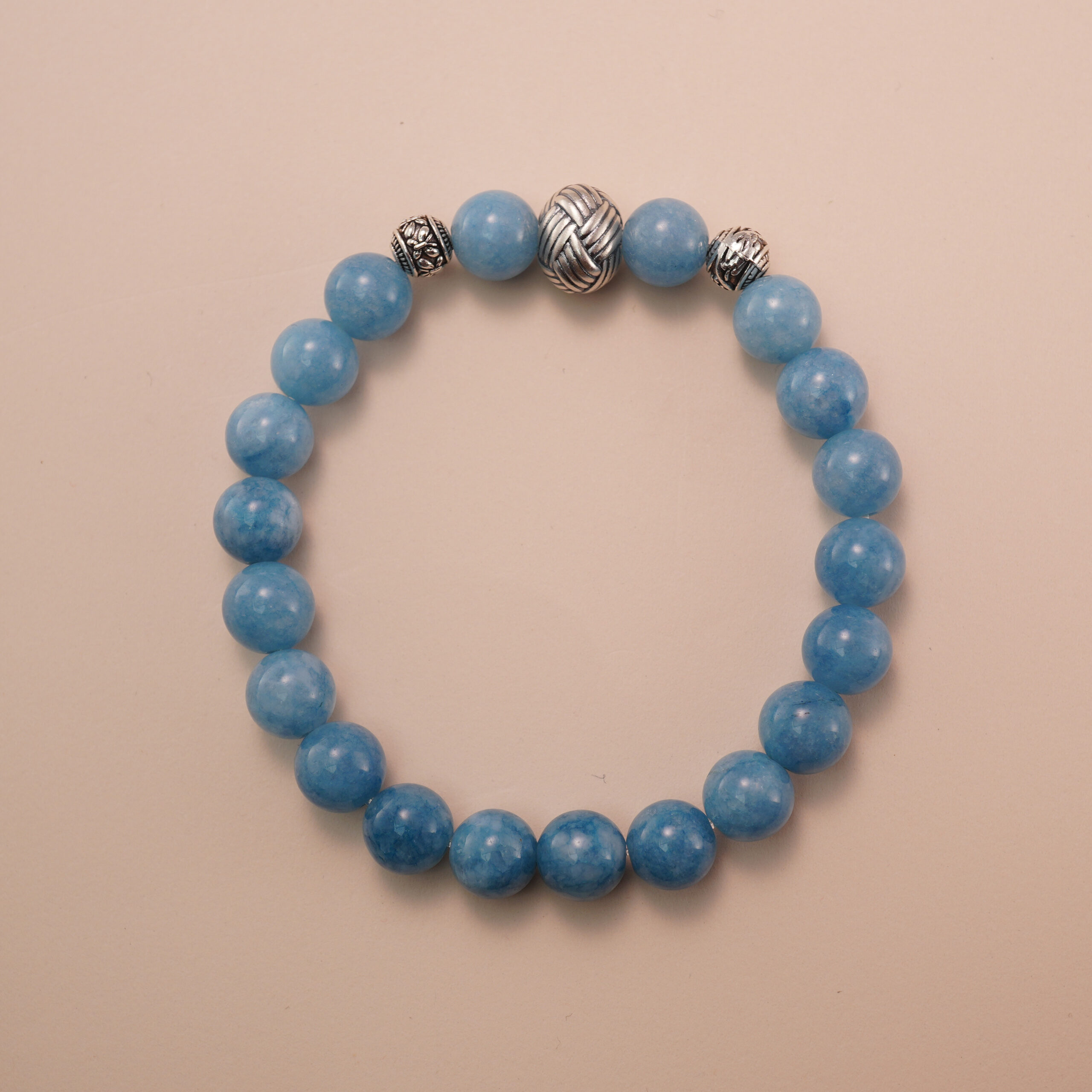 This aquamarine bracelet with silver beads brings clarity and calm, crafted to support peaceful thoughts and effortless elegance in daily wear. A gentle reminder to embrace stillness and trust your inner voice.