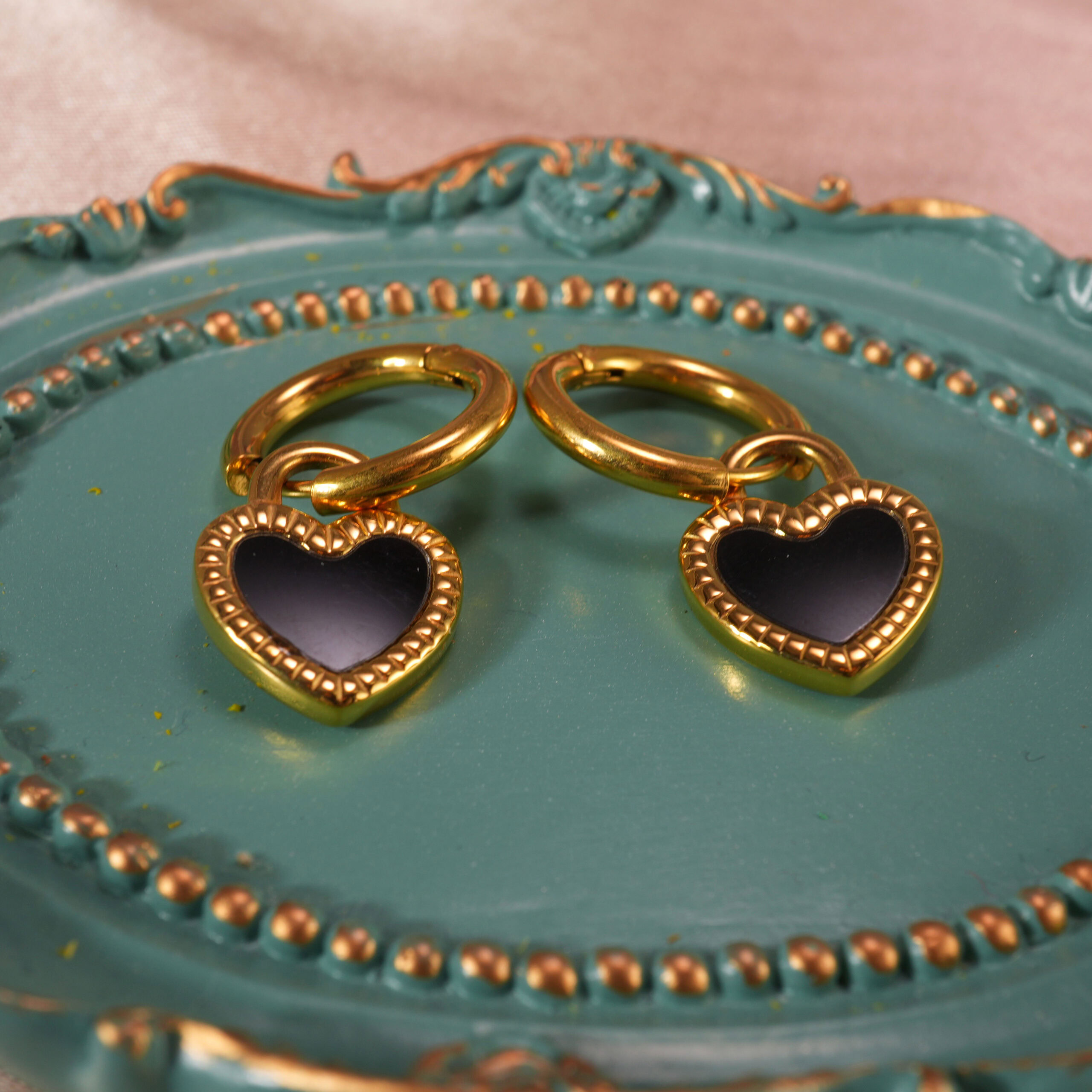 - Chic enamel hoop earrings featuring glossy black heart charms