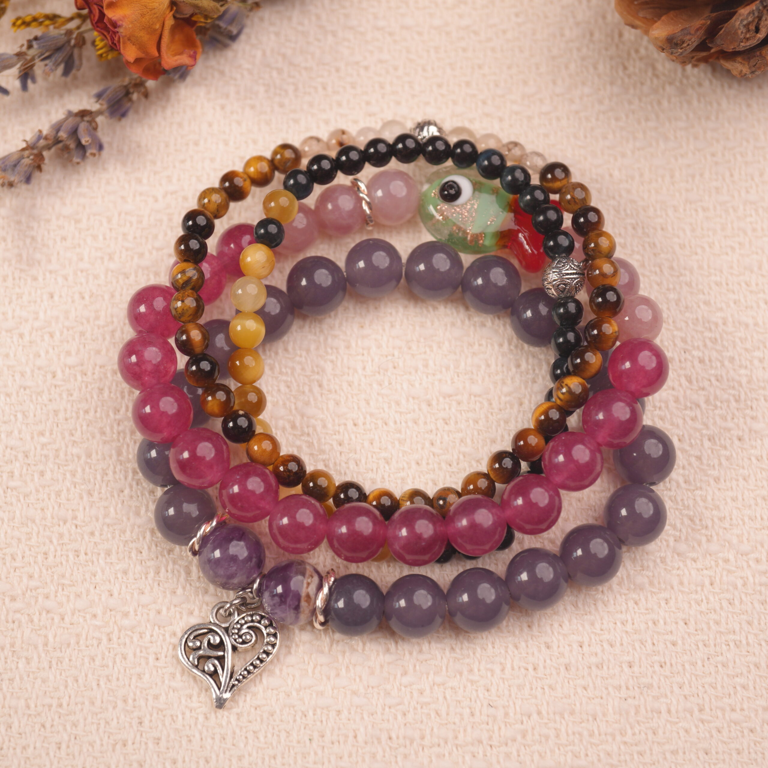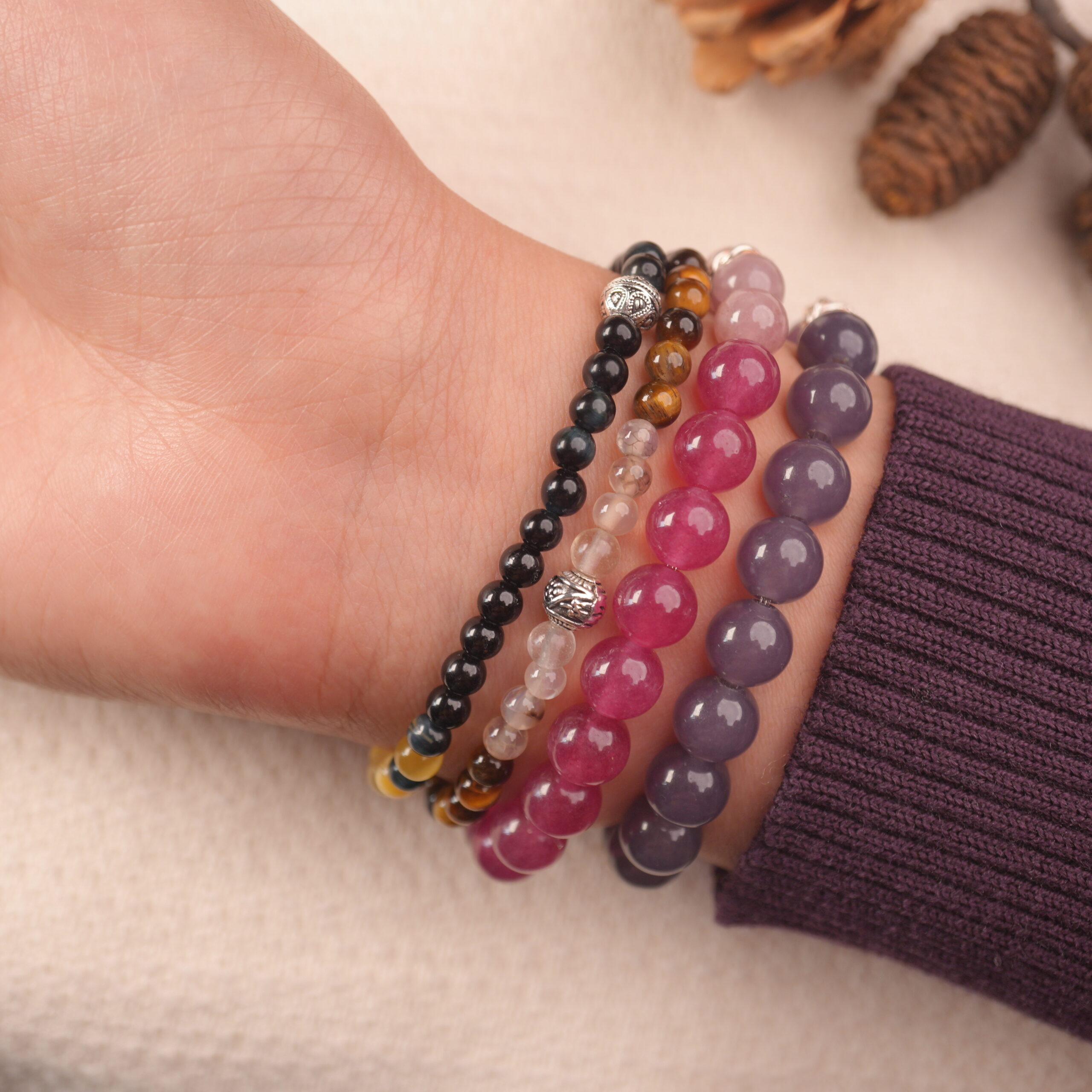 • Soothing bracelet set crafted with jade and pastel healing gemstones