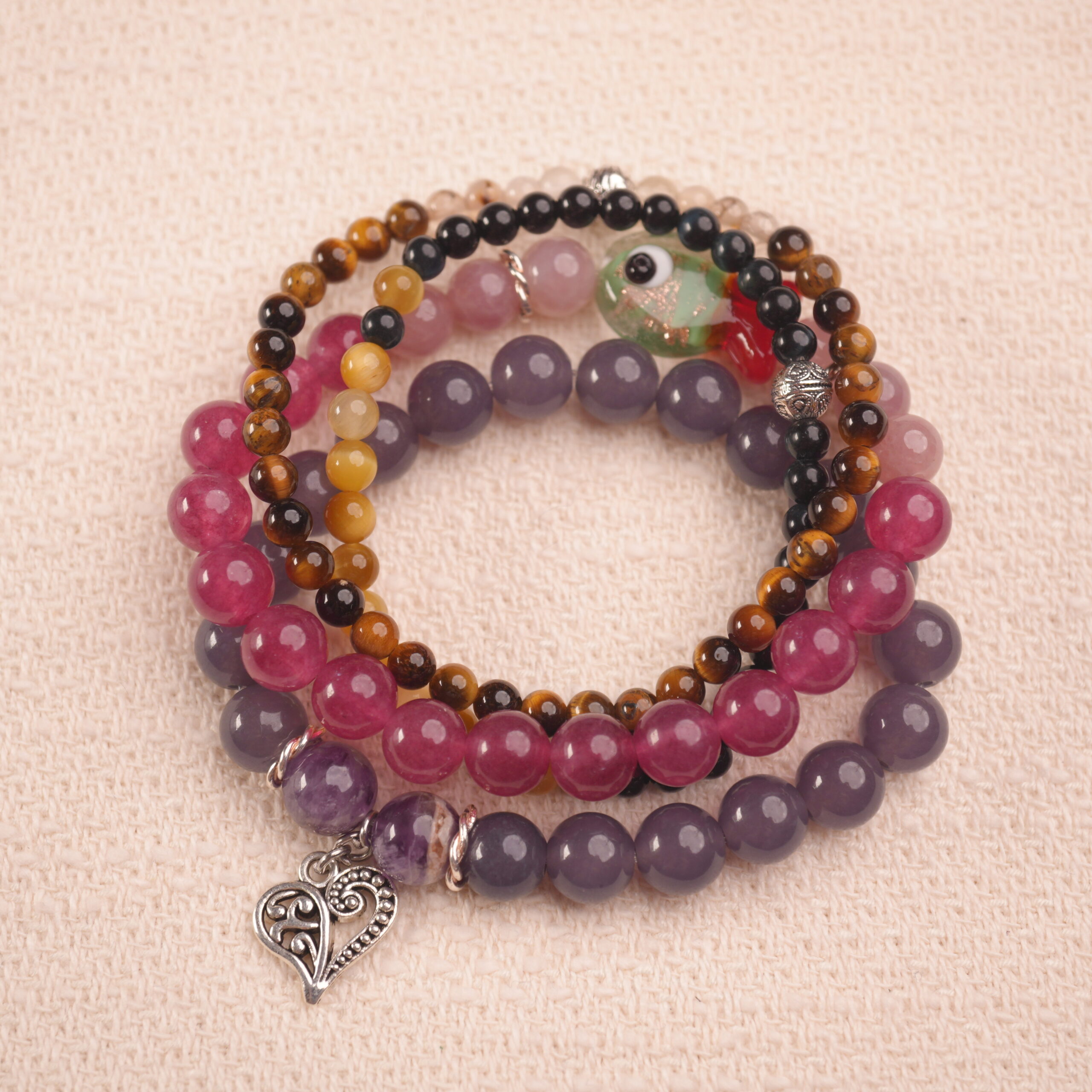 A calming mixed-gemstone bracelet set featuring jade and soft pastel healing crystals, bringing peaceful energy, emotional balance, and gentle everyday relaxation in a beautiful layered stack.