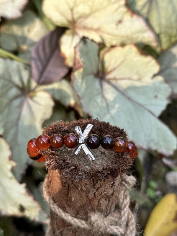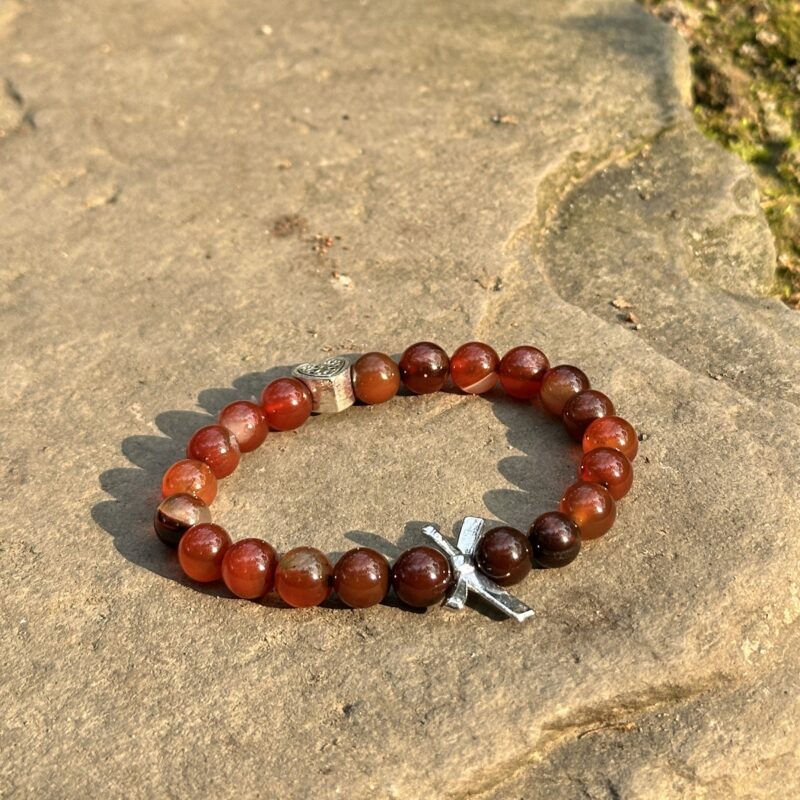 This bracelet has such a strong, grounding presence. The deep red-brown tones look rich and natural, especially in sunlight, and each bead has its own unique character. The metal cross detail adds a bold yet meaningful accent without feeling heavy. It’s well-crafted, comfortable to wear, and feels solid on the wrist. A beautifully balanced piece that combines strength, calm, and timeless style — I find myself reaching for it often.