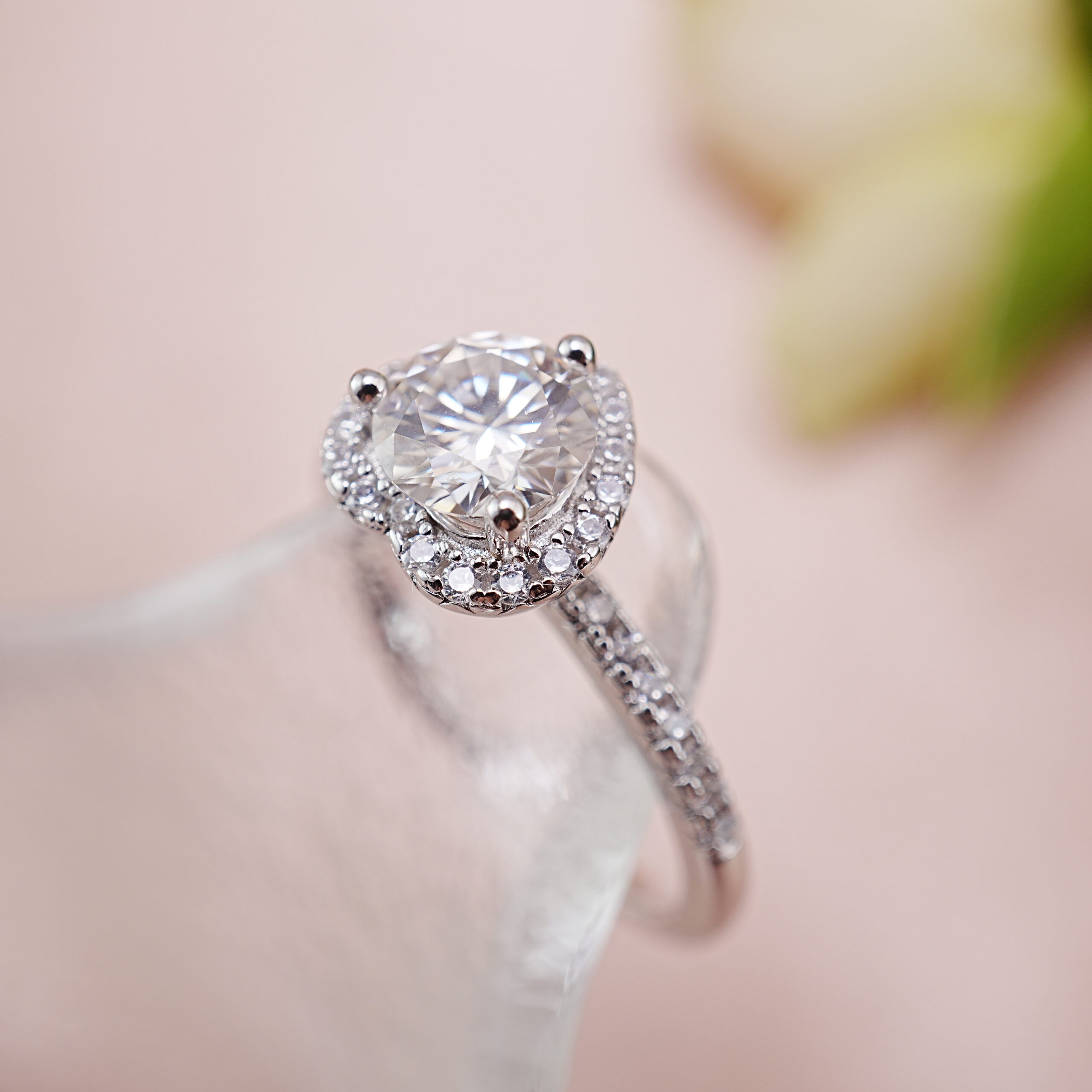 - Romantic heart-shaped moissanite ring surrounded by a brilliant halo