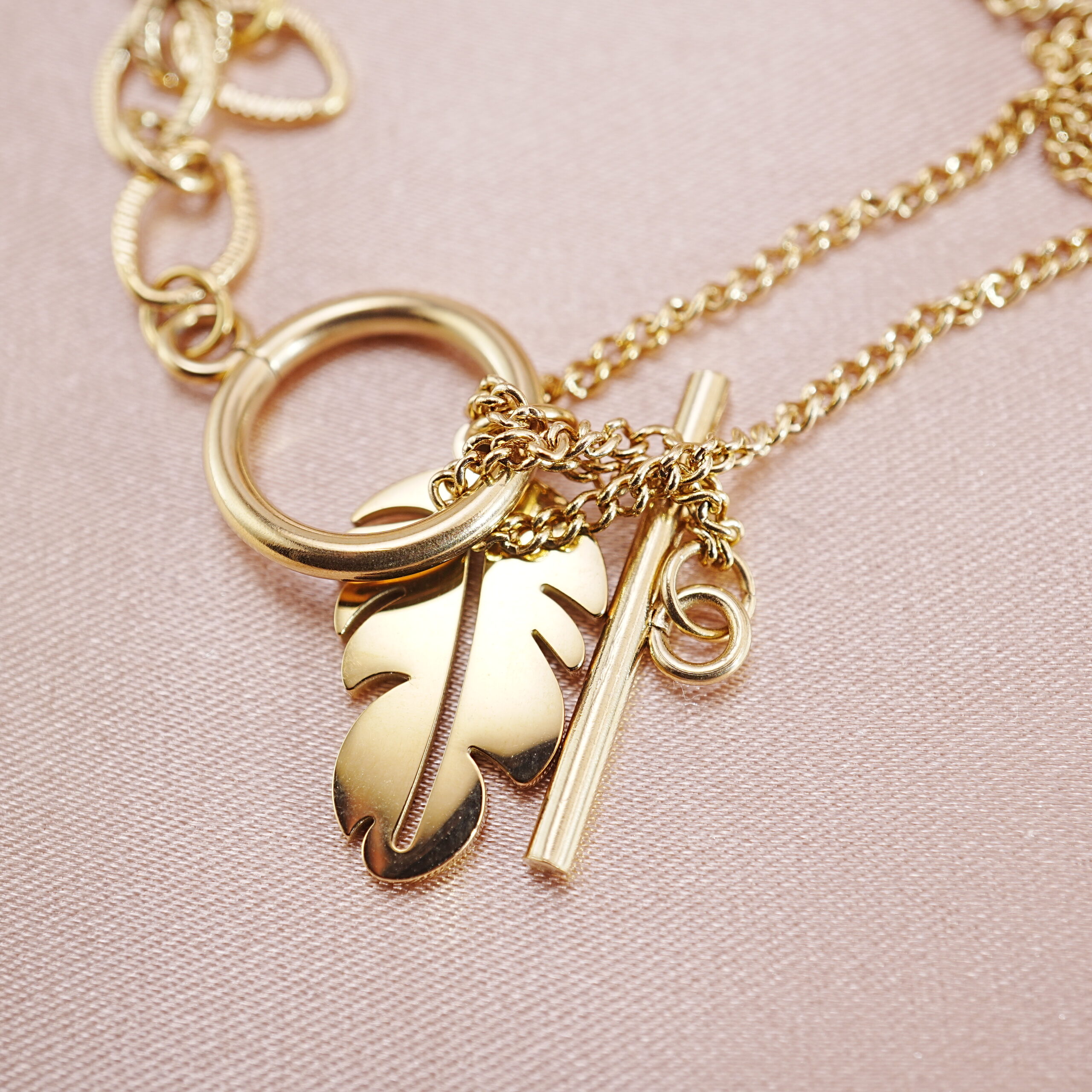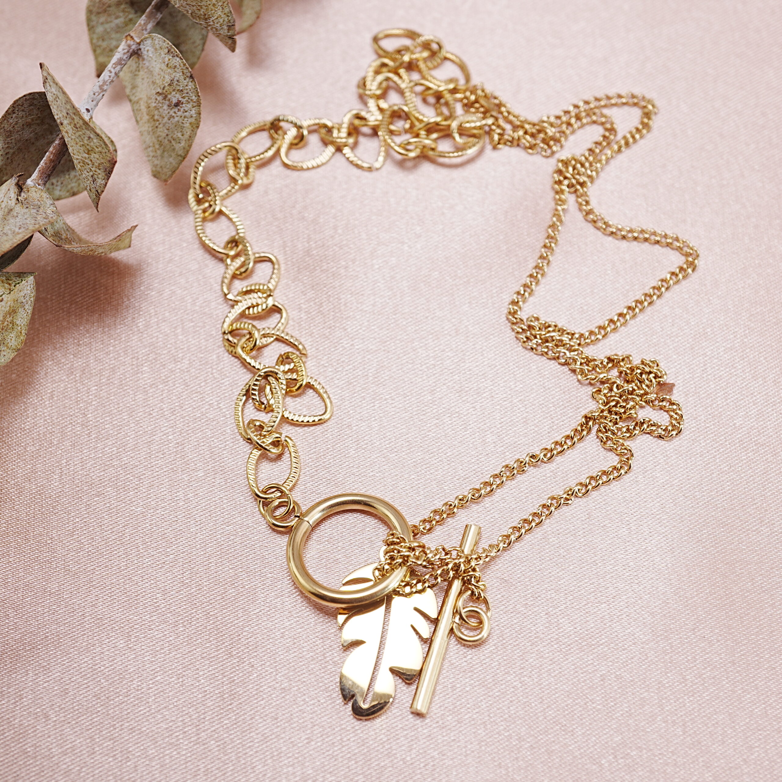 A chic toggle chain necklace featuring a polished leaf pendant, perfect for effortless everyday style, elegant layering, and adding a soft nature-inspired touch to any outfit.