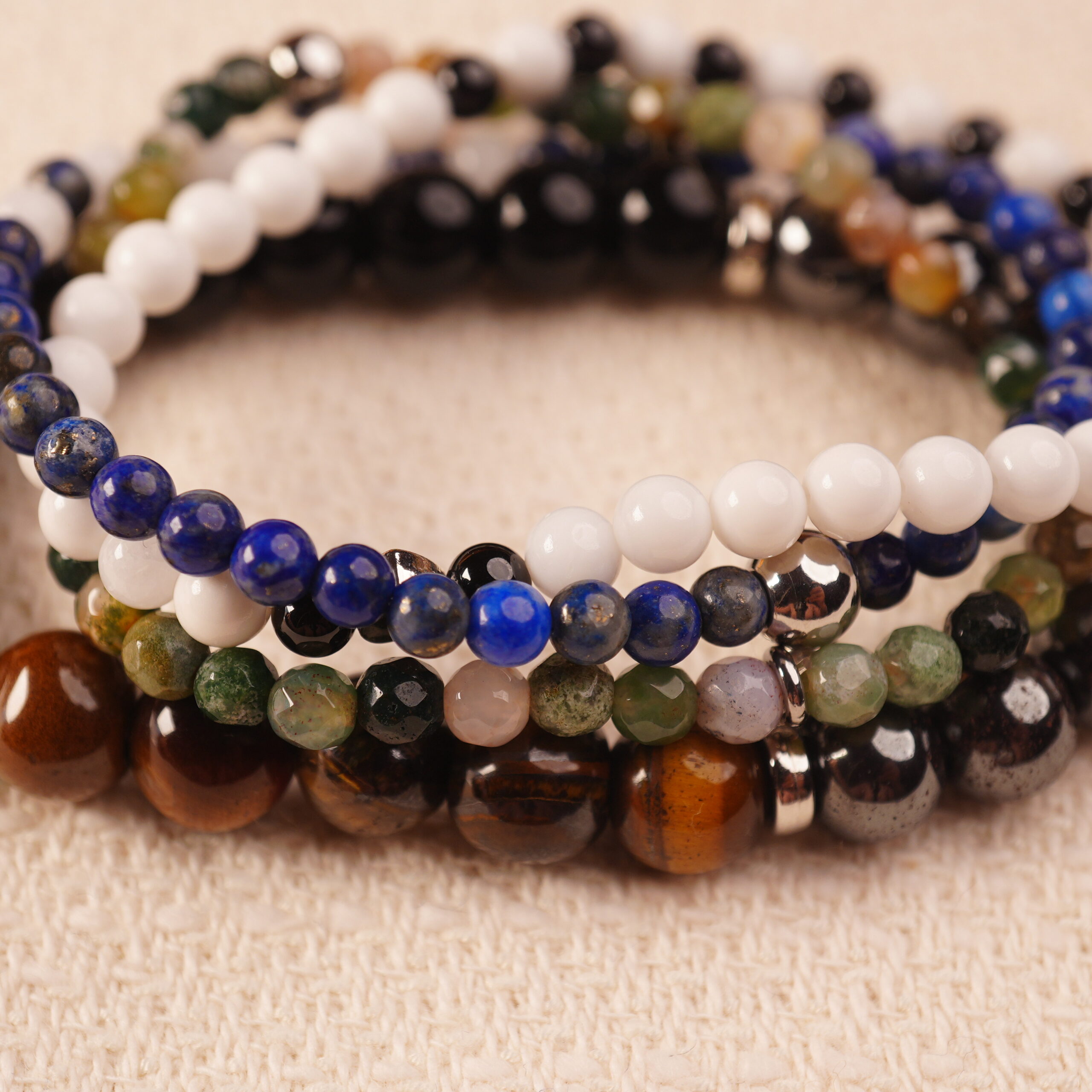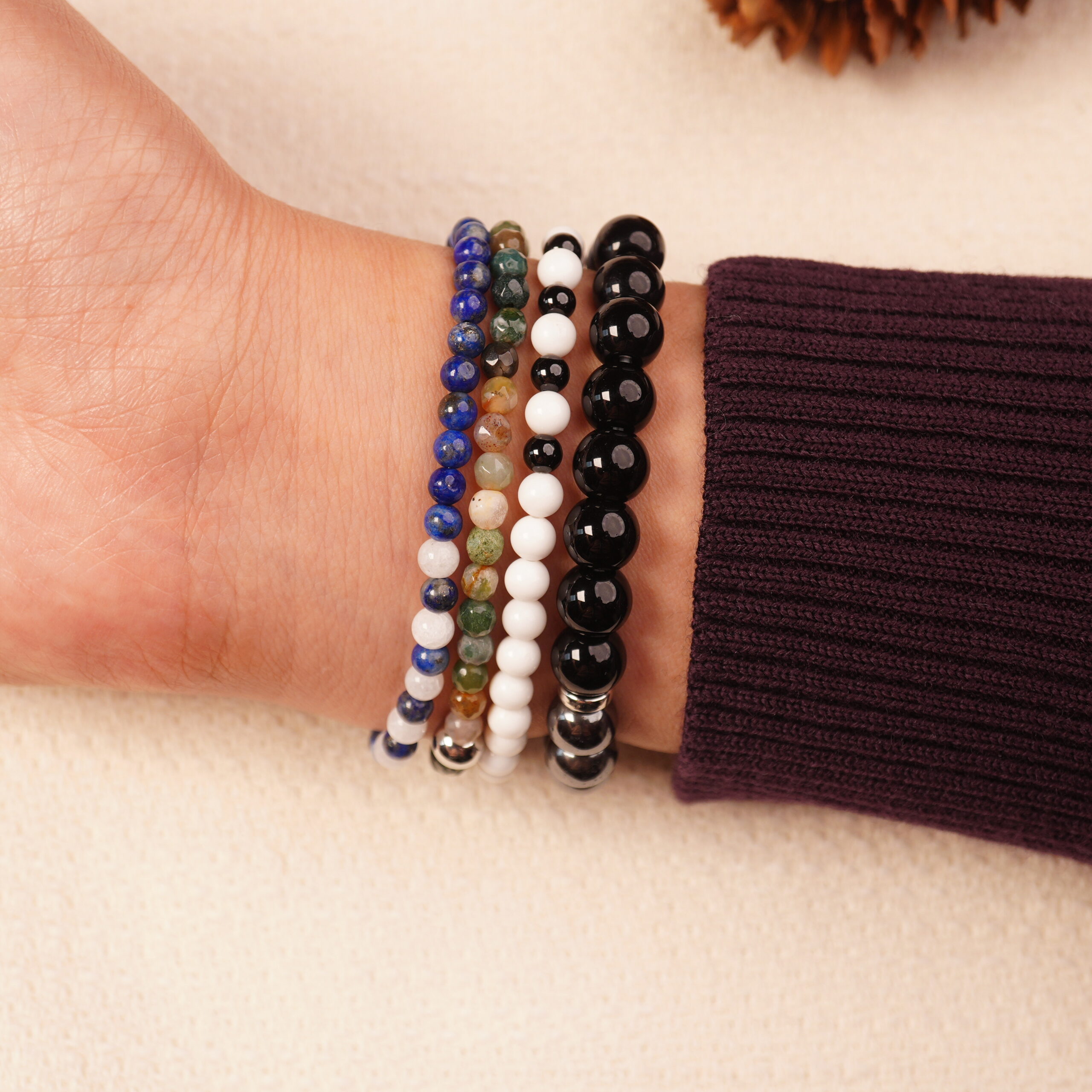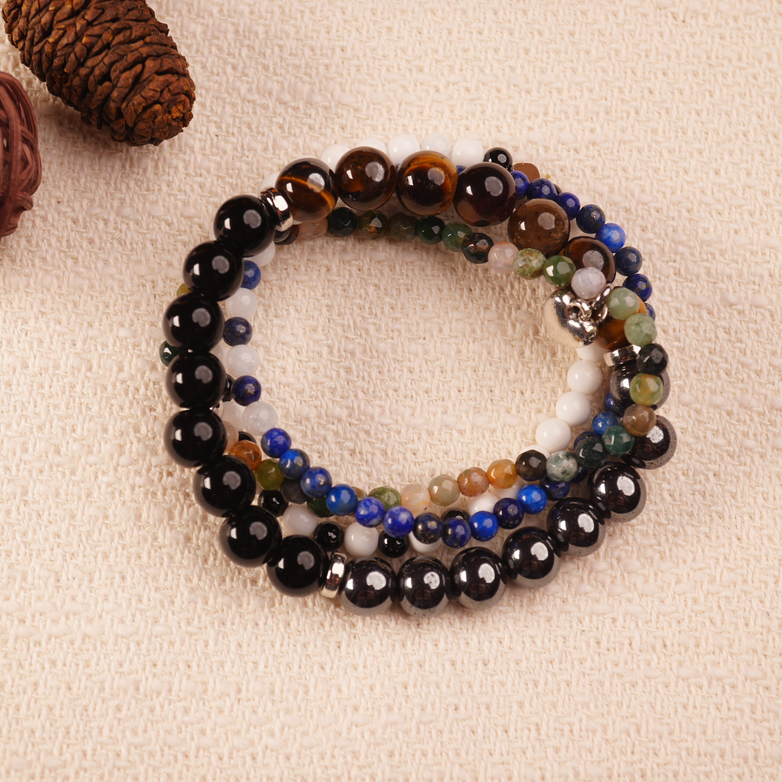 - Grounding and protective bracelet stack in deep, earthy tones