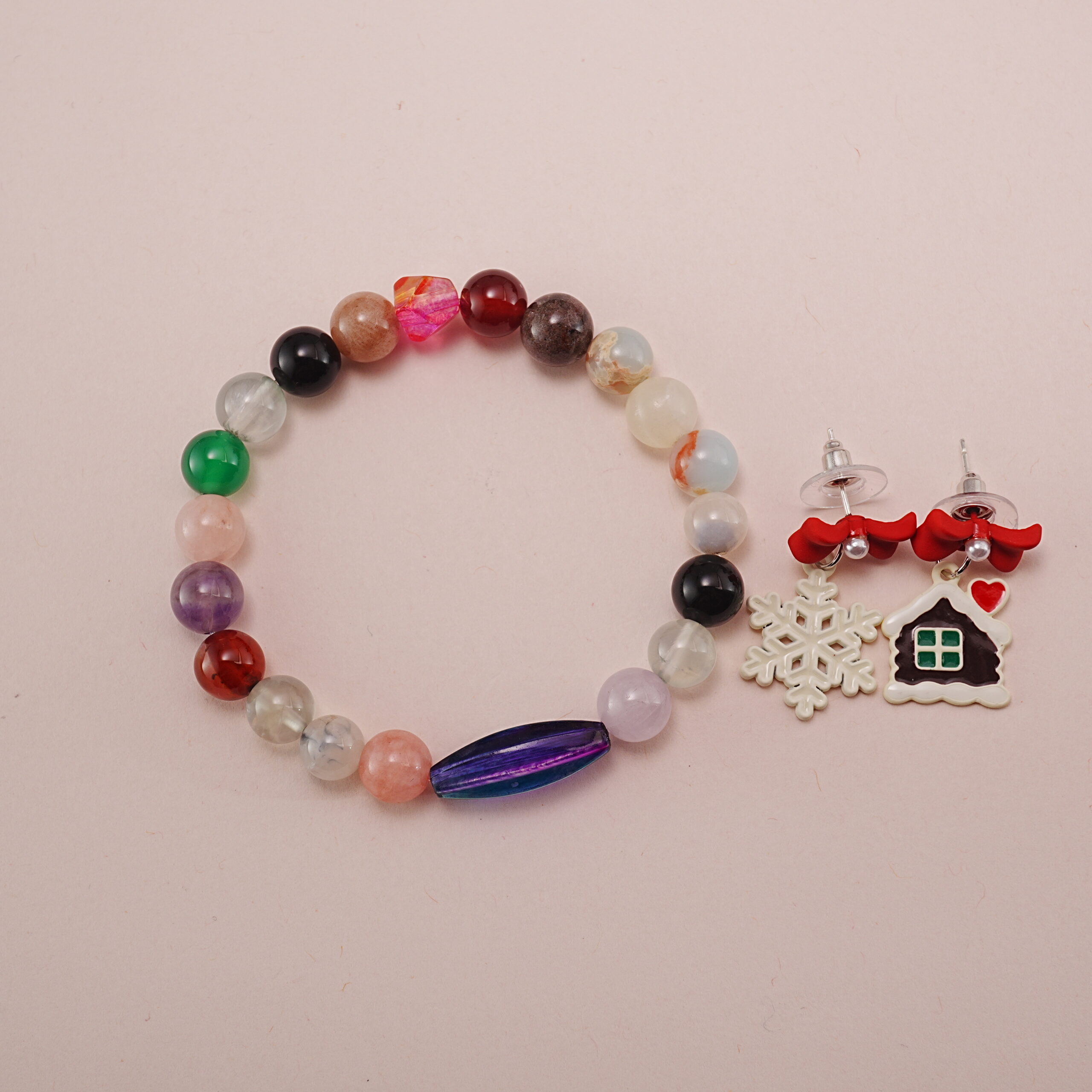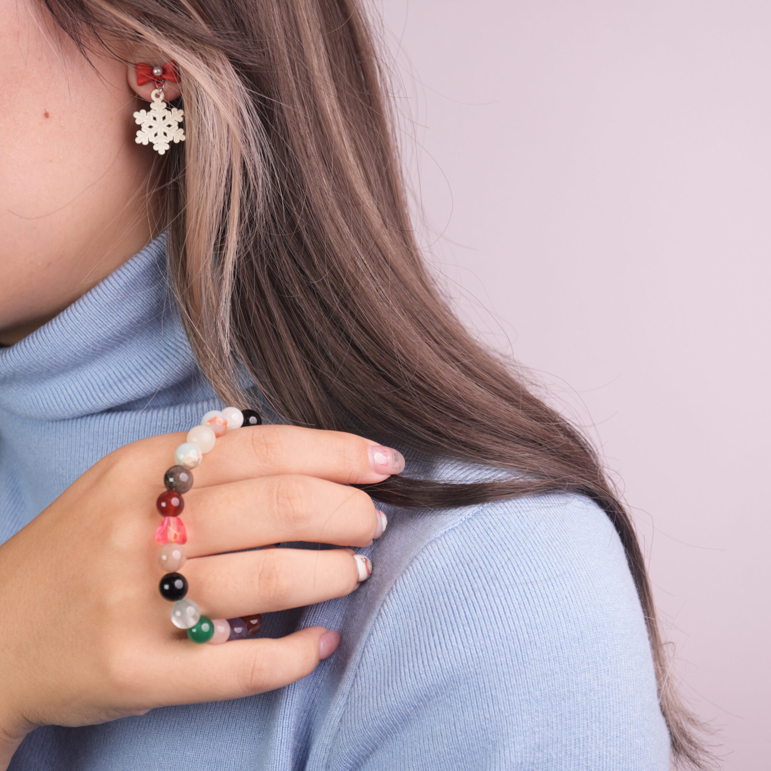 - Handmade multicolor gemstone bracelet paired with festive Christmas bow earrings
