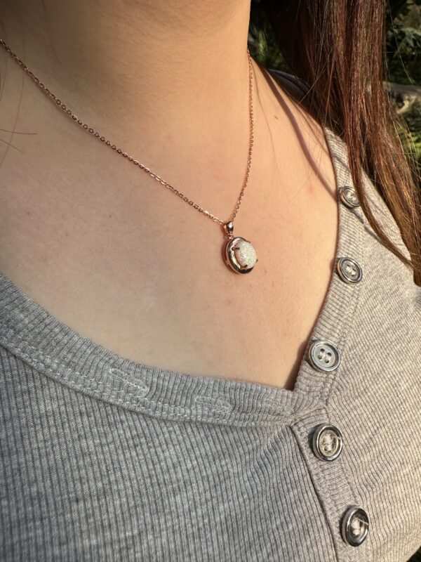 The opal pendant looks even more beautiful in natural light. The stone has a soft, iridescent glow that changes subtly with movement, and the rose gold setting gives it such a warm, elegant feel. The size is just right — delicate but still eye-catching — and it sits perfectly on the collarbone. I love how effortless it looks with a simple top. It’s become one of those everyday pieces that quietly elevates any outfit.