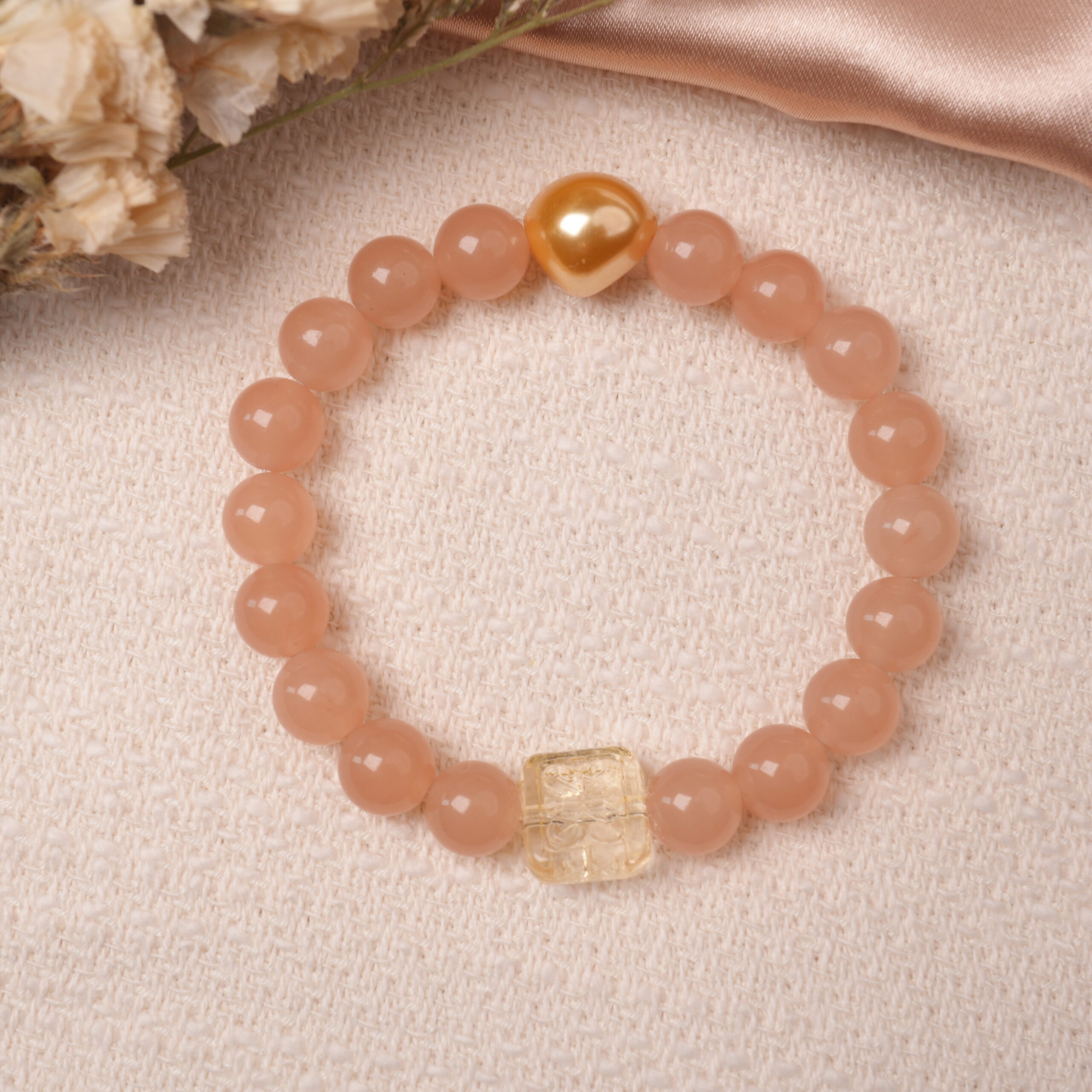 A romantic and feminine bracelet featuring peach moonstone and citrine, adorned with a delicate gold heart charm—perfect for promoting emotional calm, love, and gentle energy throughout your day.
