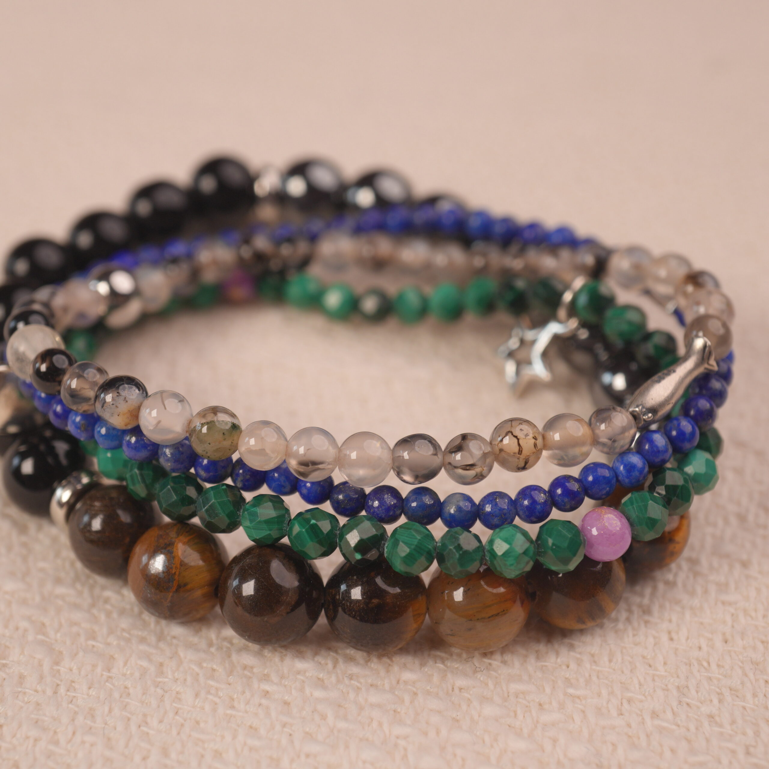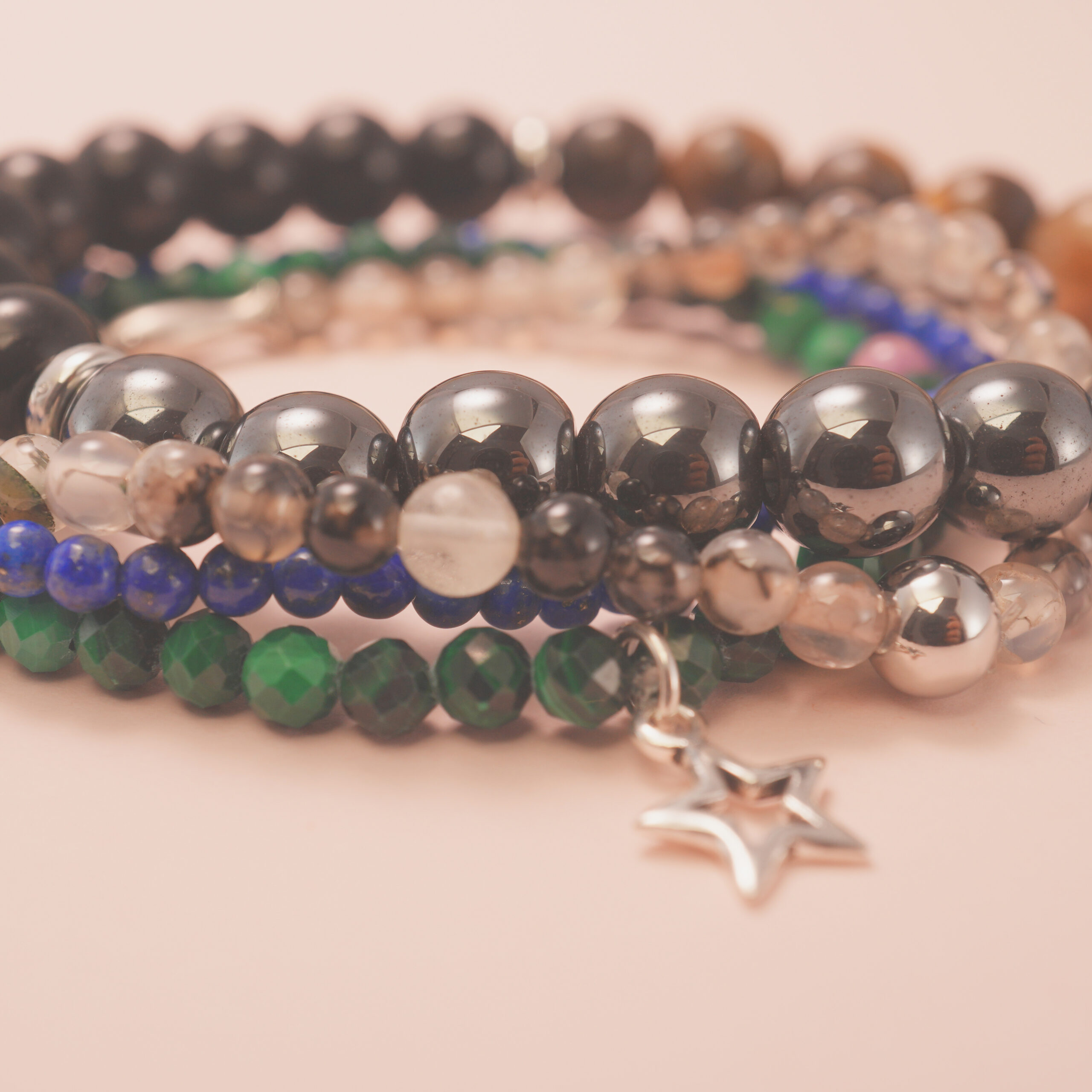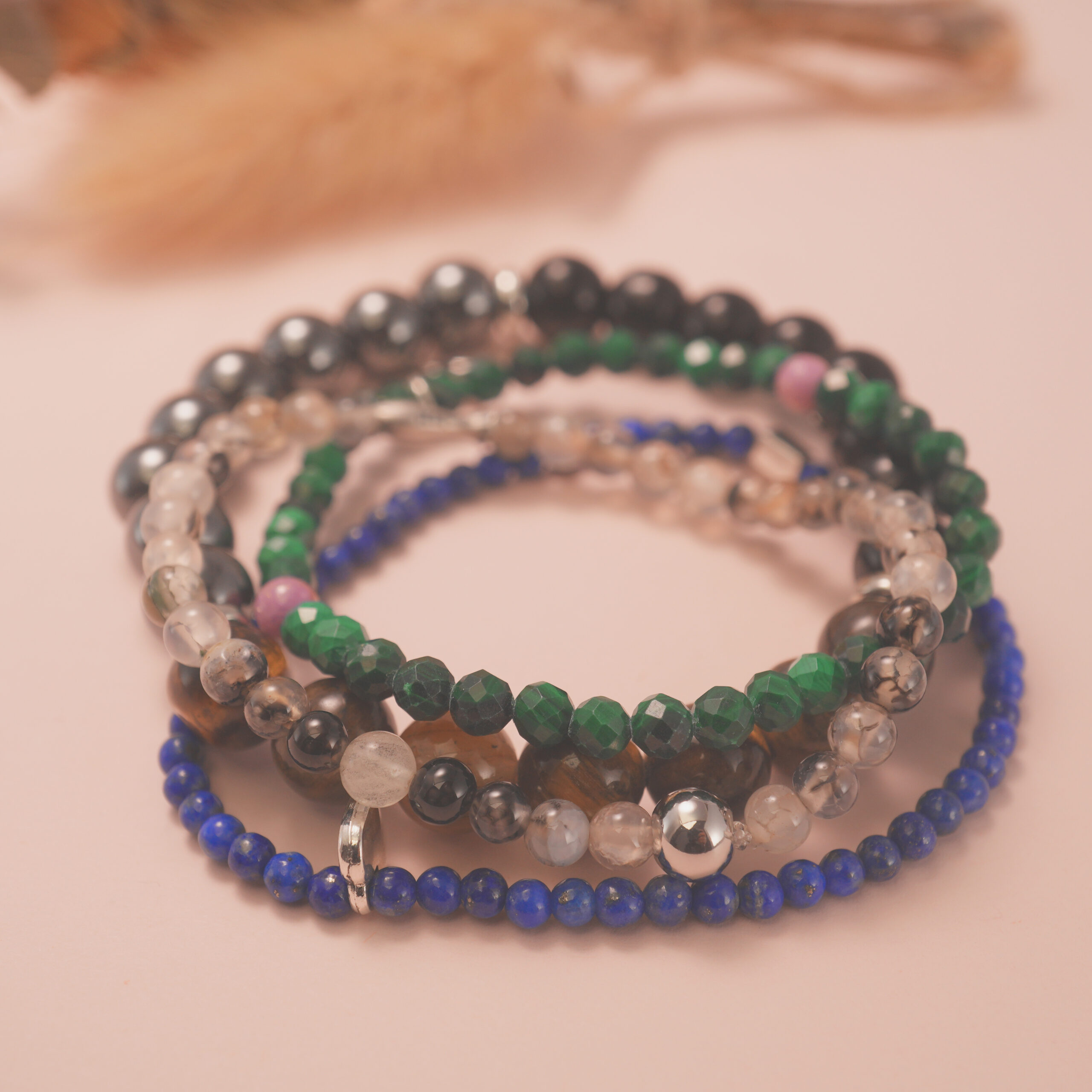- Set of multiple beaded bracelets made with obsidian, lapis lazuli, malachite, moss agate, and complementary protective stones