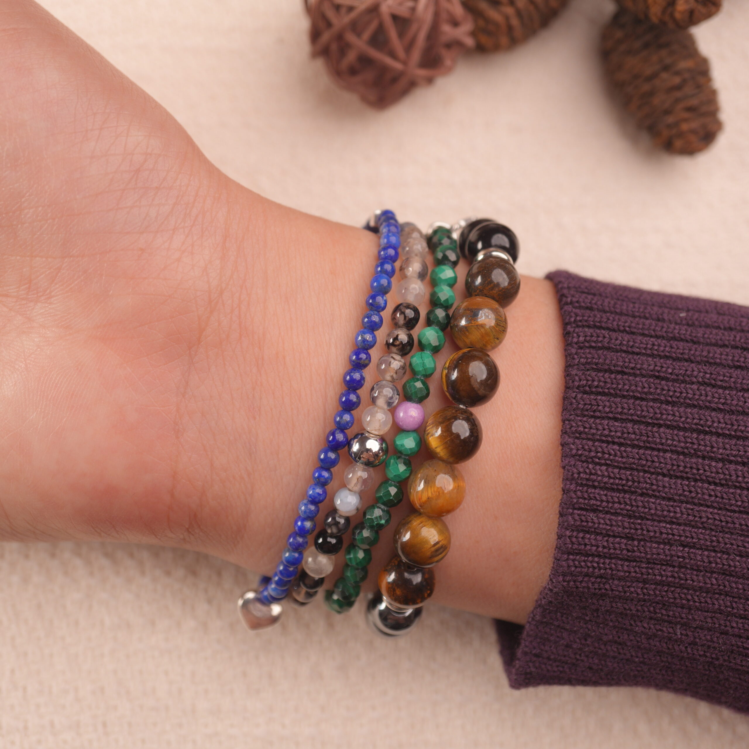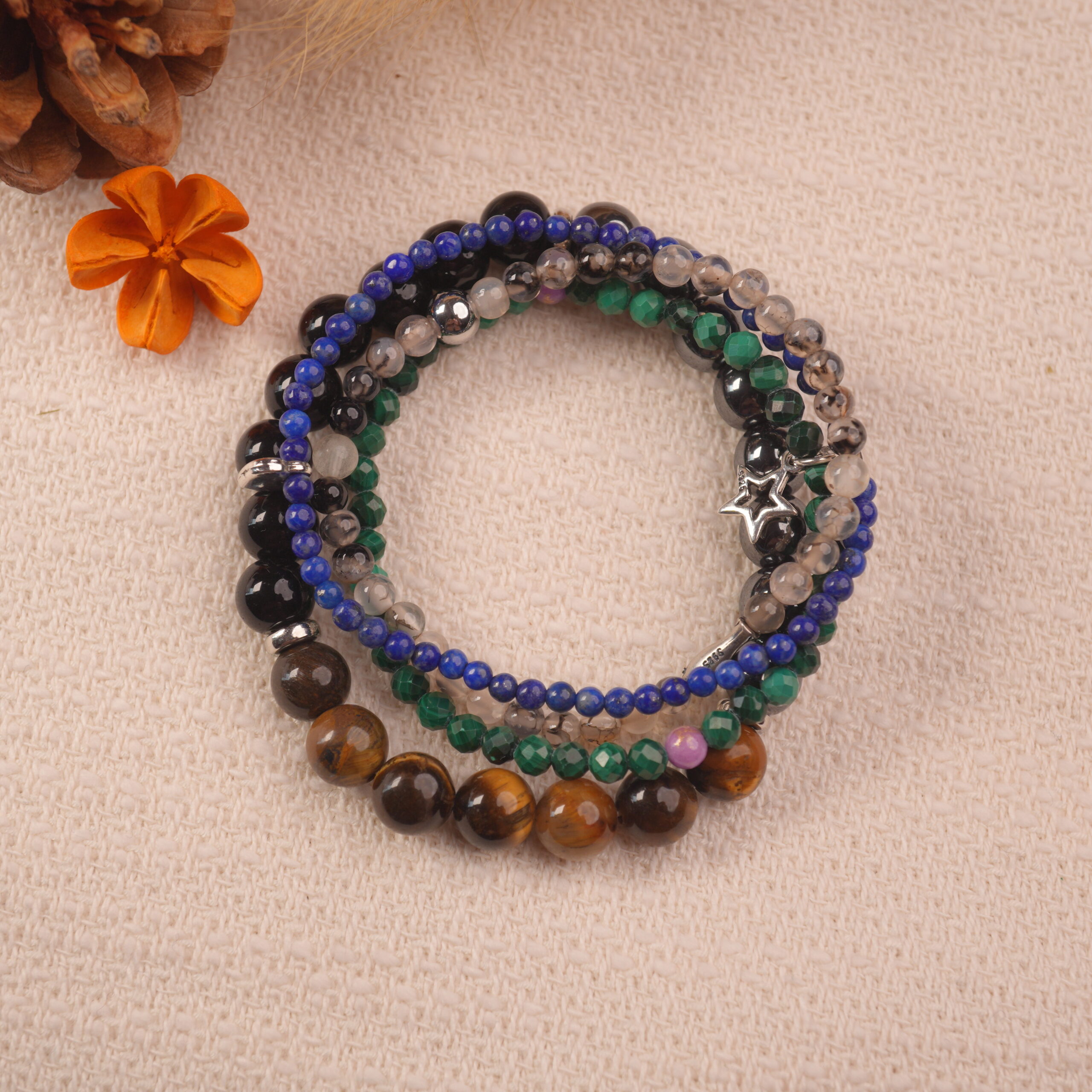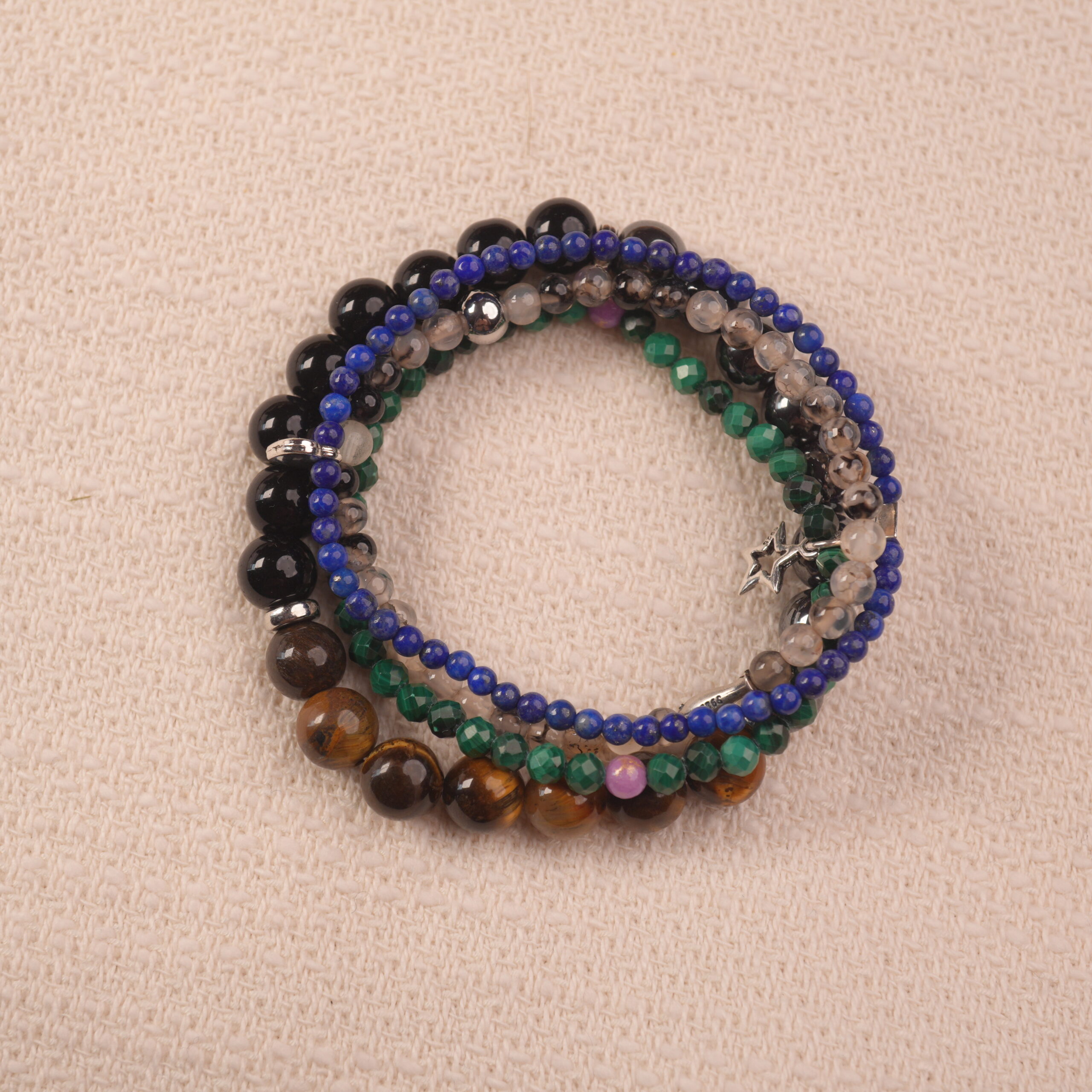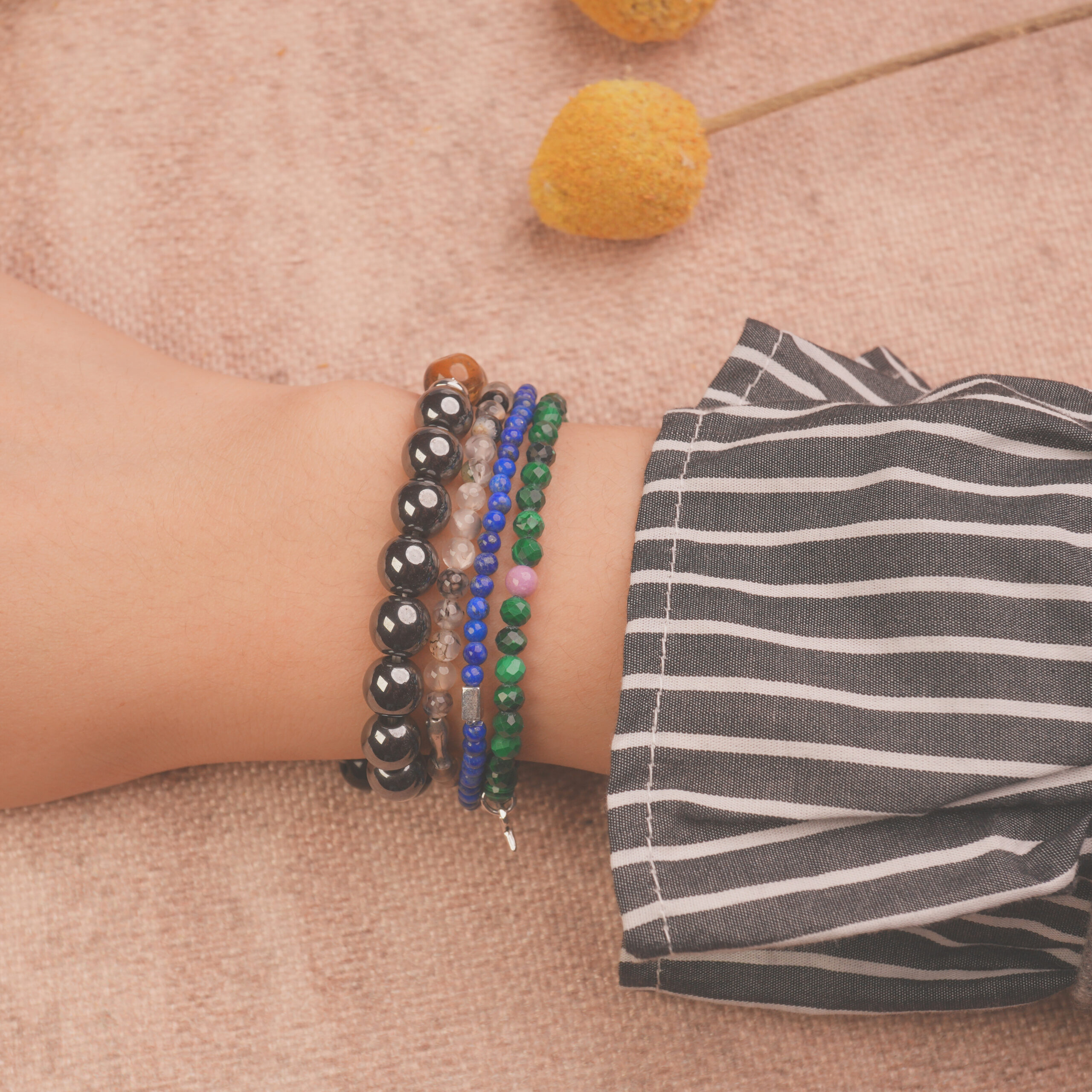 - Set of multiple beaded bracelets made with obsidian, lapis lazuli, malachite, moss agate, and complementary protective stones