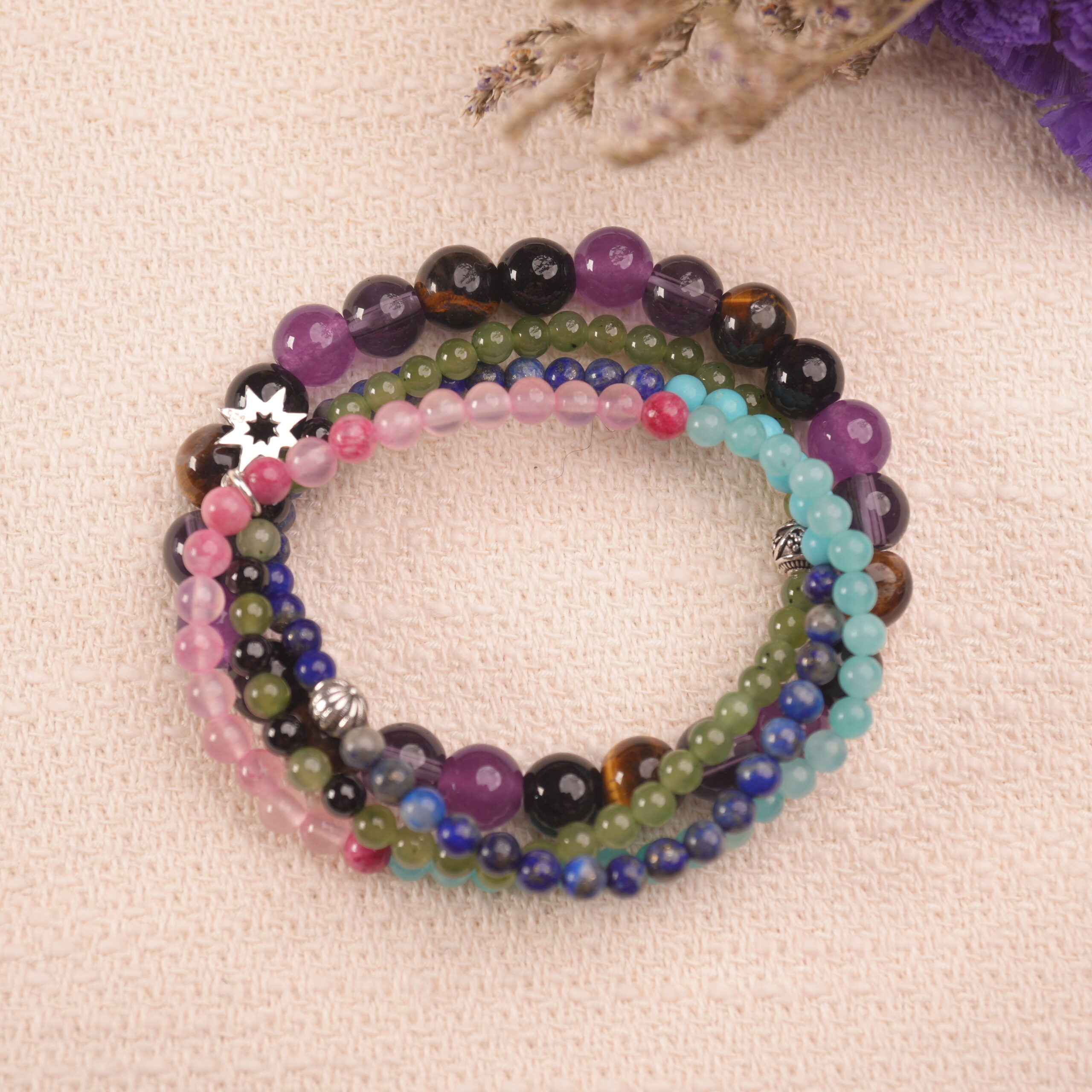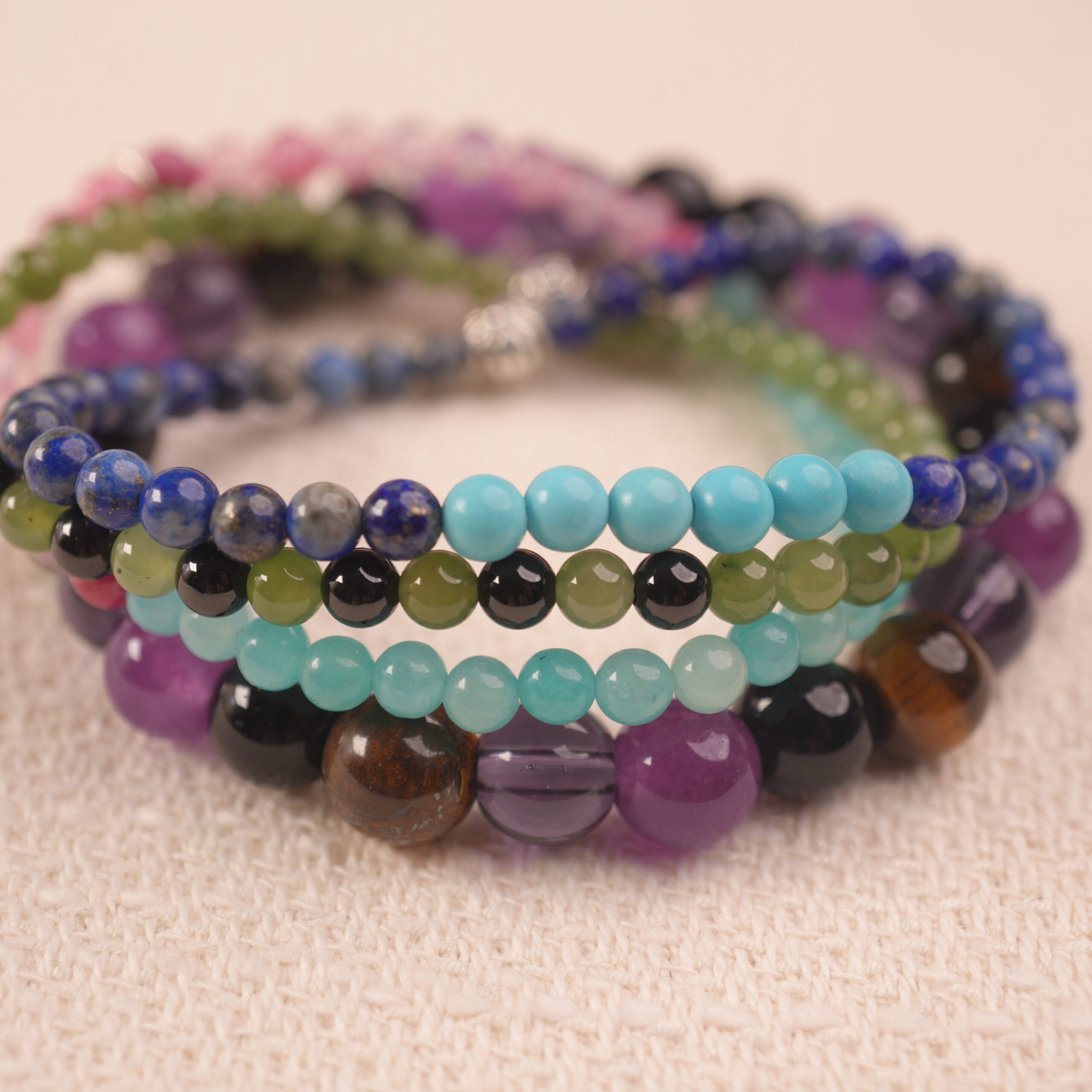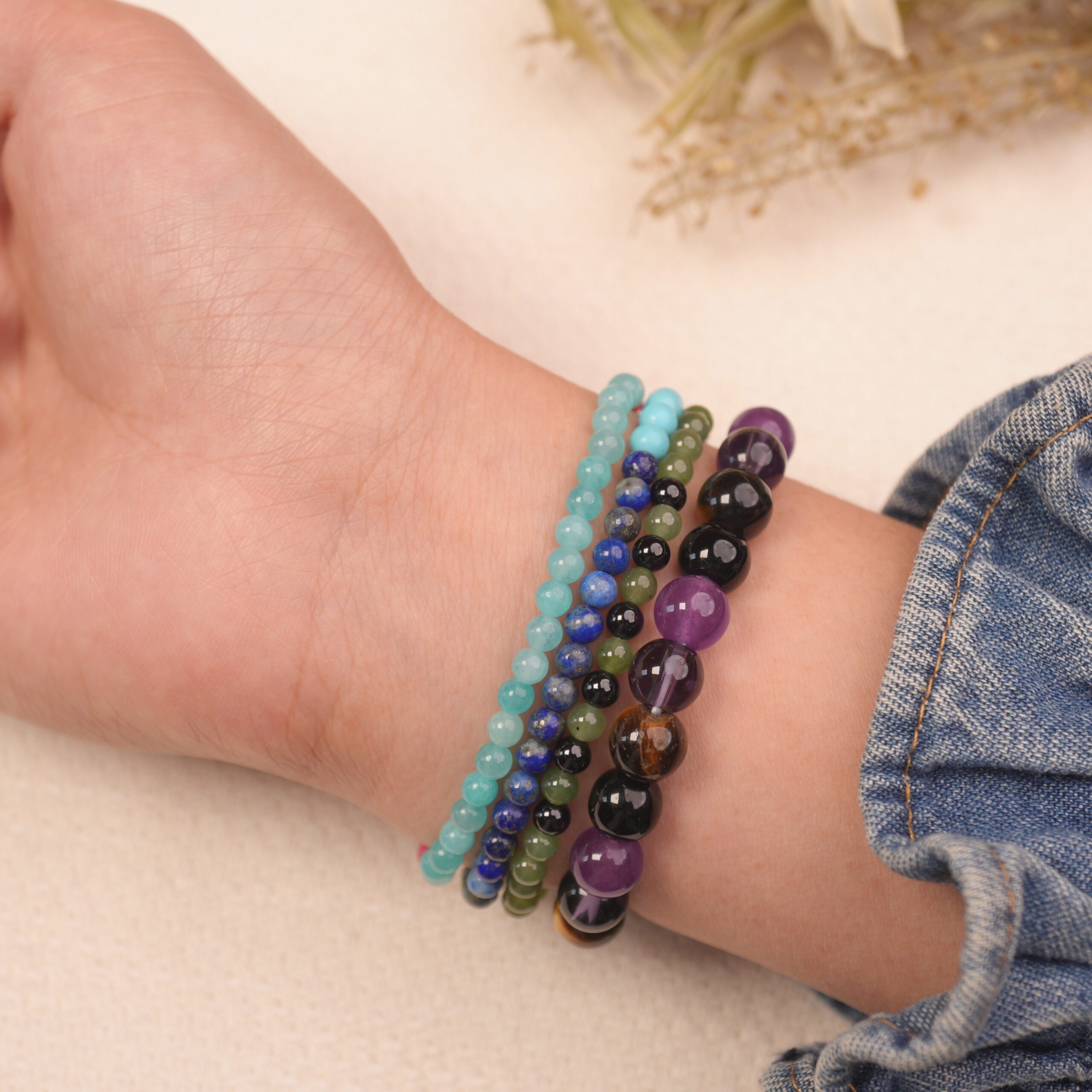 A powerful crystal bracelet stack combining Tiger Eye, Lapis Lazuli, Moss Agate, Amazonite, and more — designed to support protection, grounding, clarity, and emotional resilience in daily life.