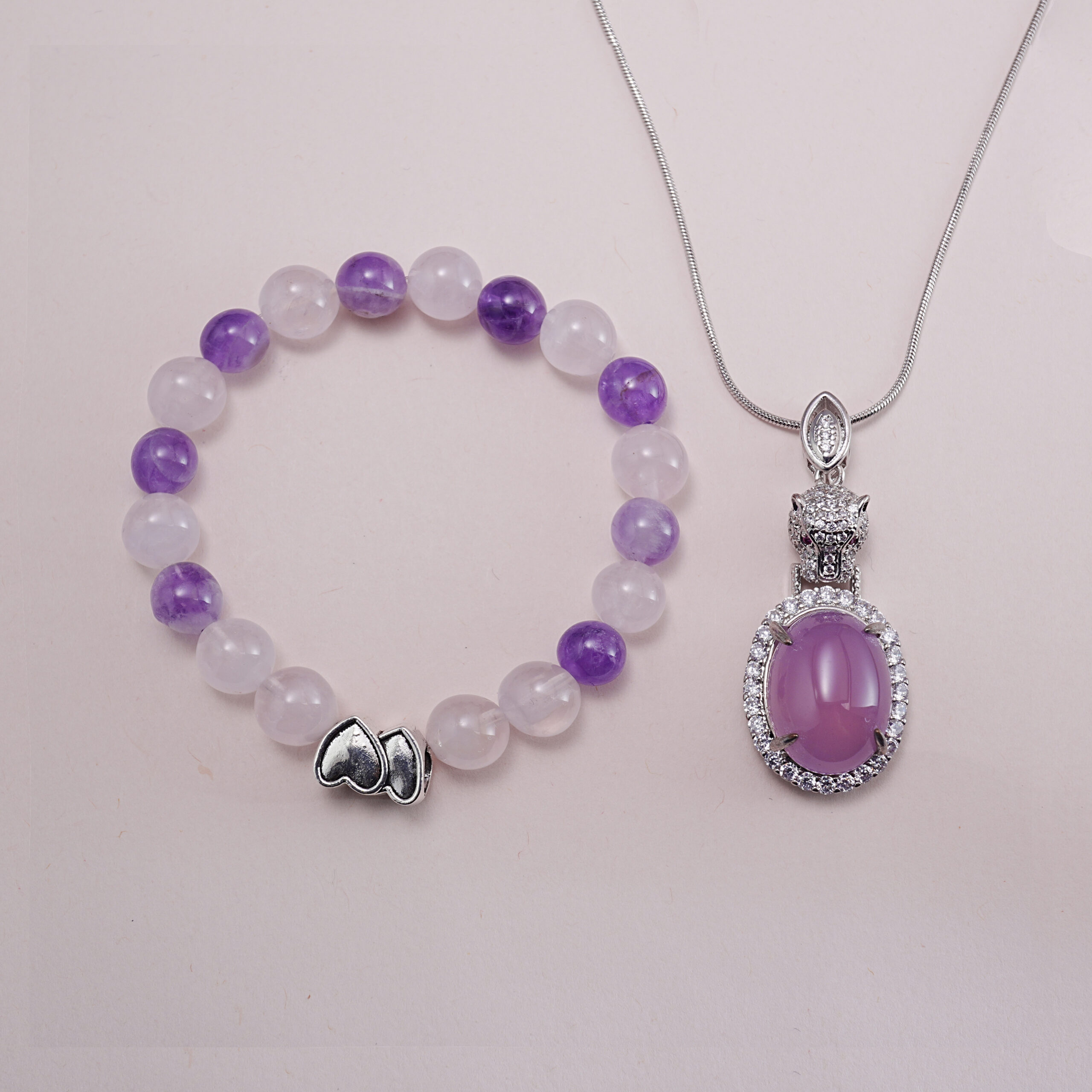 Purple Amethyst & Rose Quartz Bracelet with Amethyst Pendant Set – Perfect for Holidays
