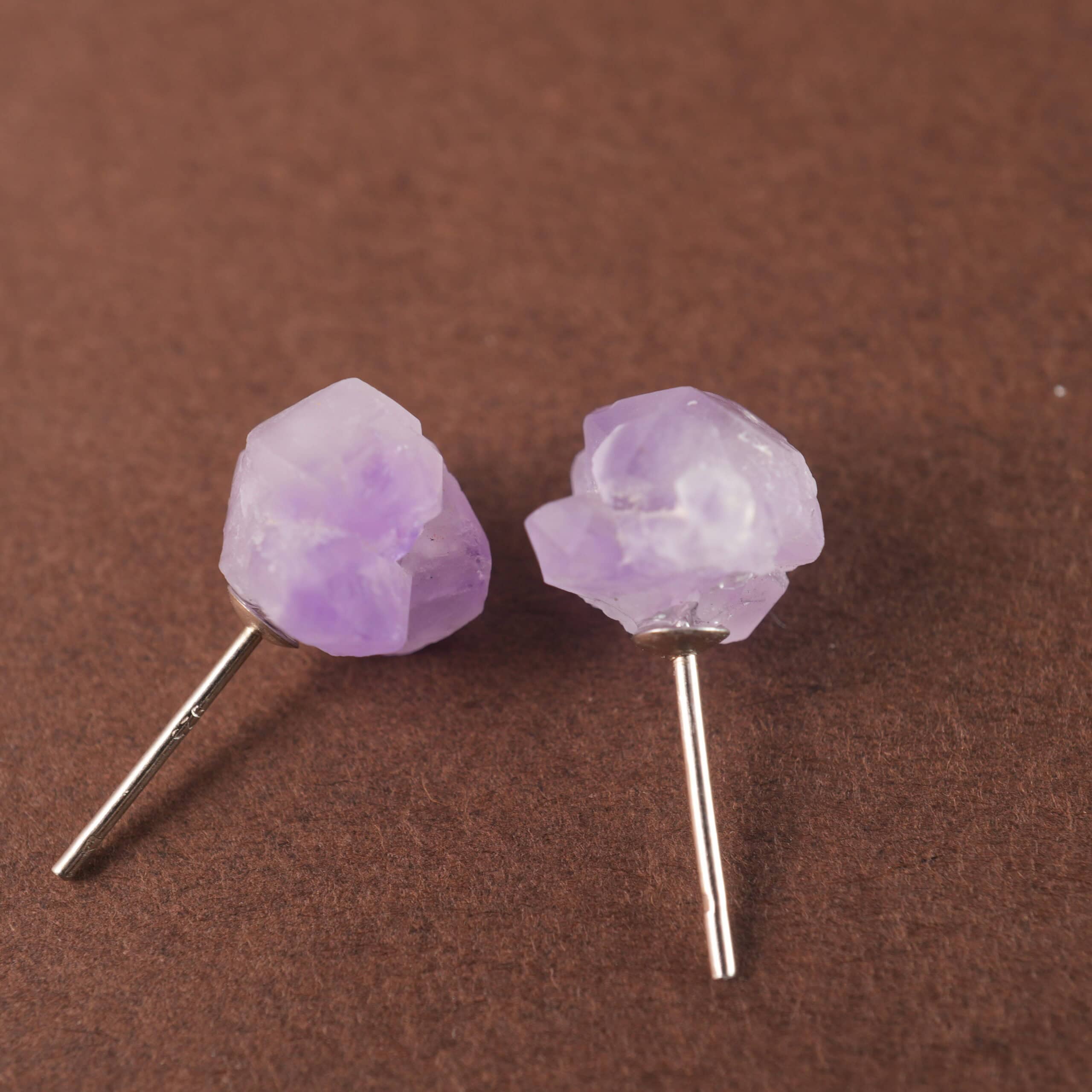 Raw Amethyst Stud Earrings featuring natural unpolished crystals that radiate calming energy and spiritual clarity. Set in a minimalist design to highlight their organic beauty and raw texture. A meaningful accessory for daily balance, healing, and effortless style.