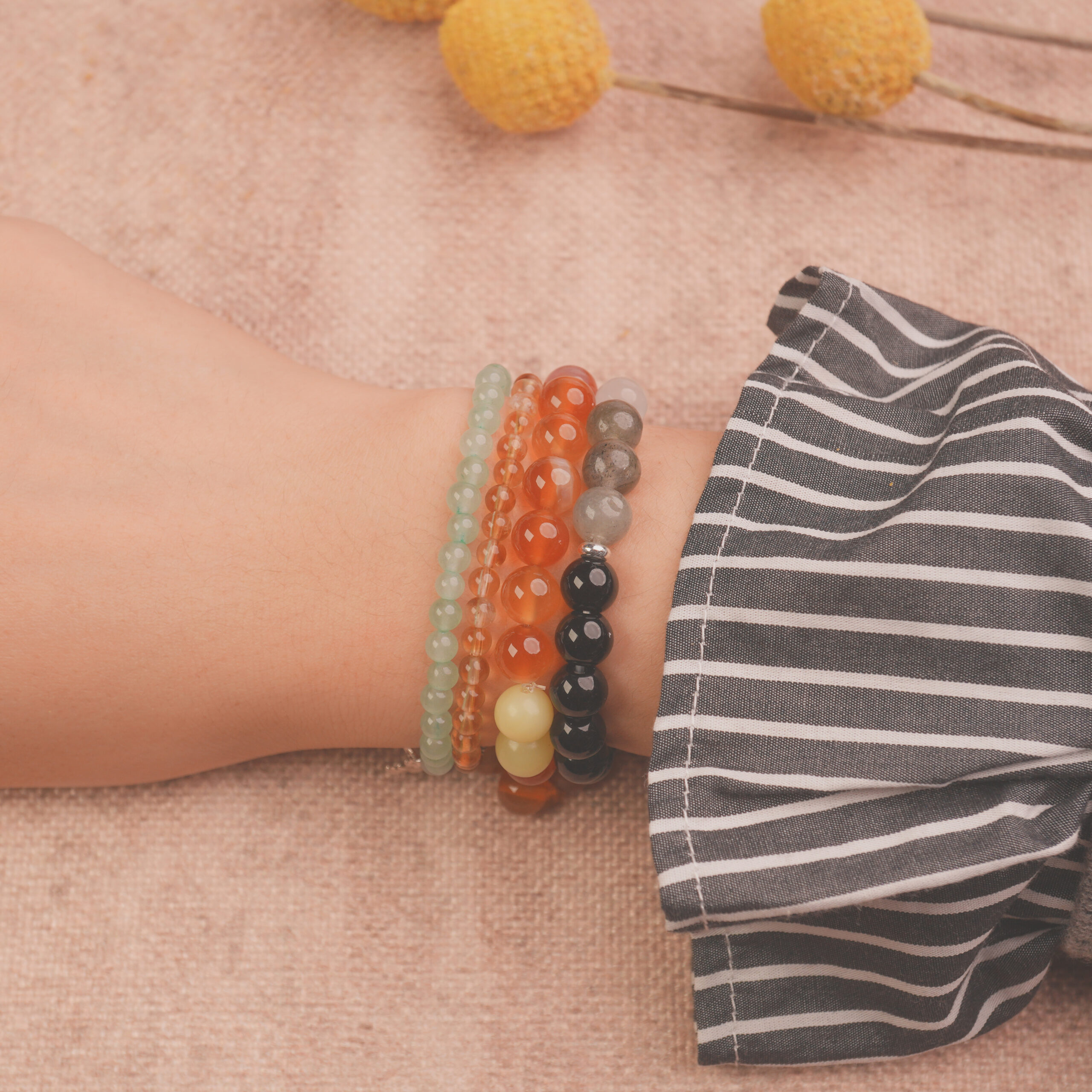 - Handcrafted beaded bracelet set designed to energize and strengthen