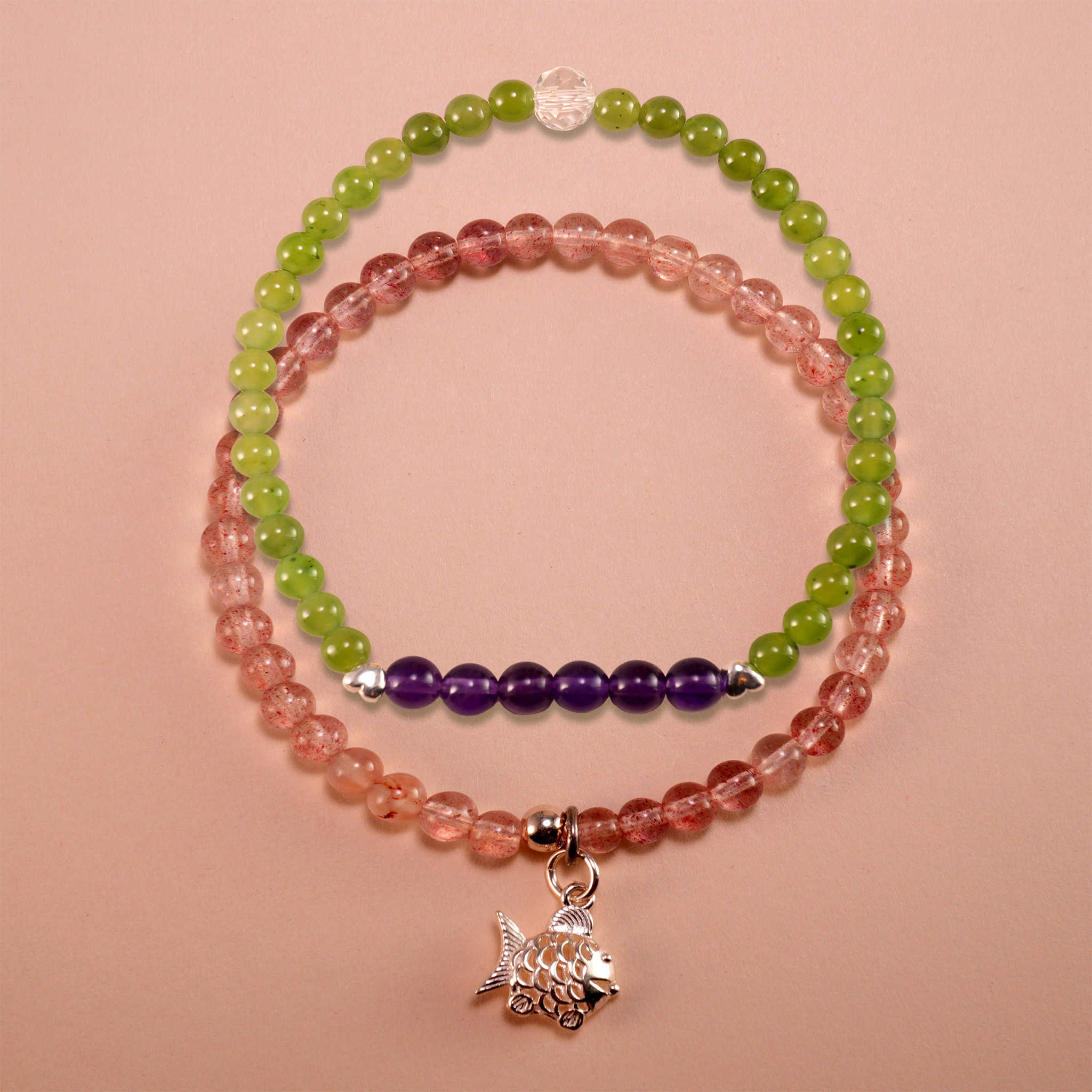 • Includes green chalcedony, amethyst, and strawberry quartz