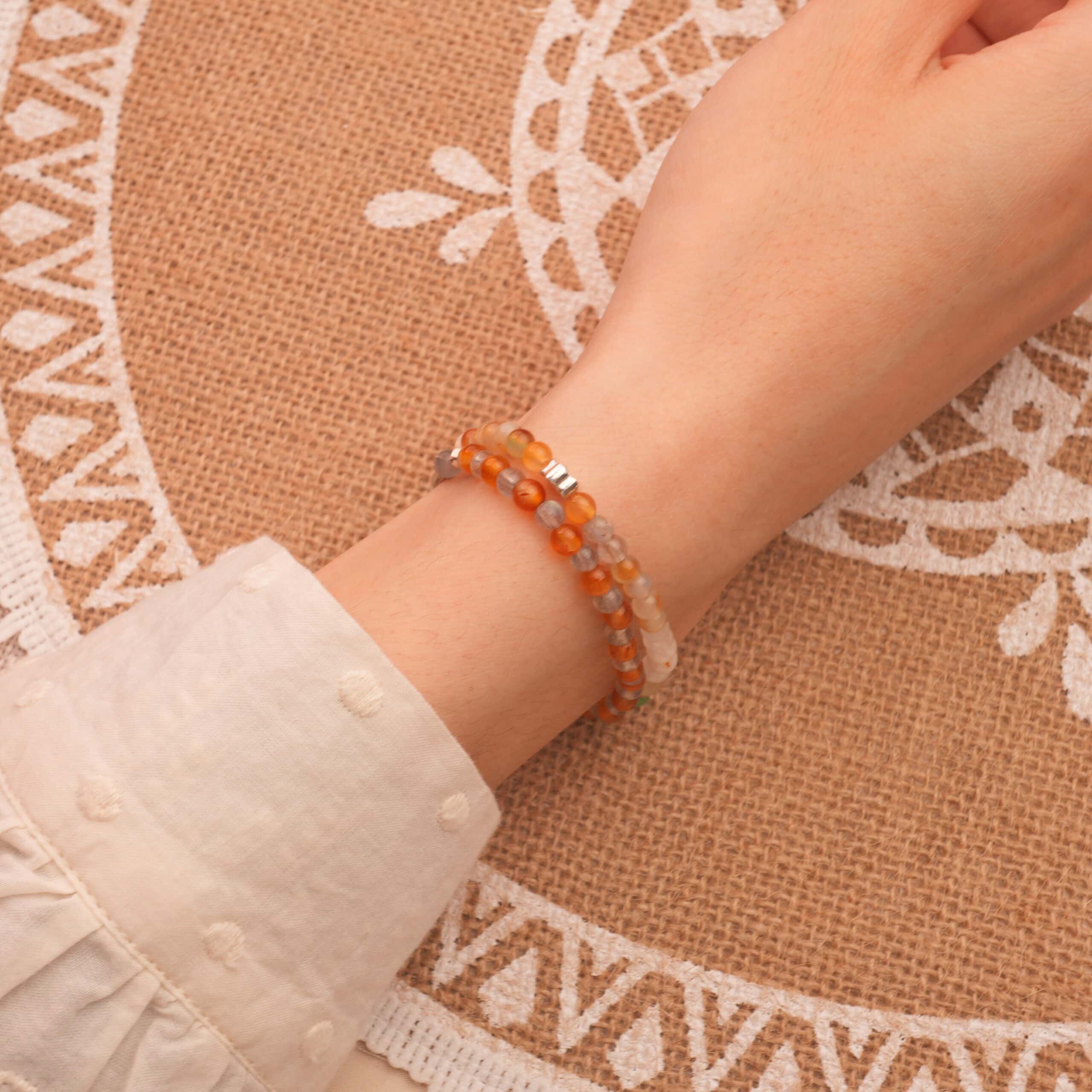 Stacked Bracelets featuring orange, gray, and yellow-green Chalcedony, combining grounding, emotional calm, and gentle energy flow. Handcrafted for a balanced, earthy look that soothes the spirit and clears the mind. A serene crystal stack perfect for daily wear, reflection, or restful gifting.