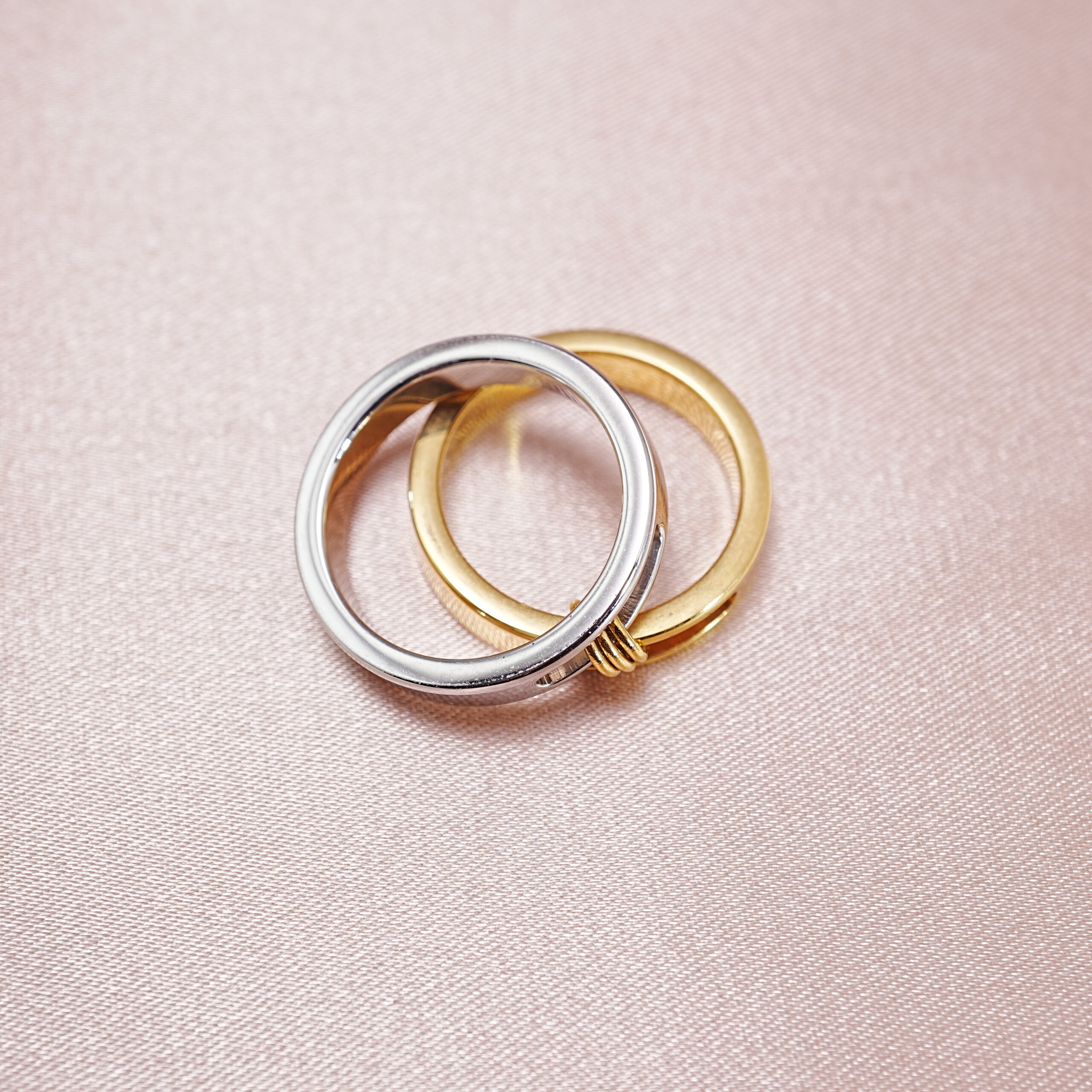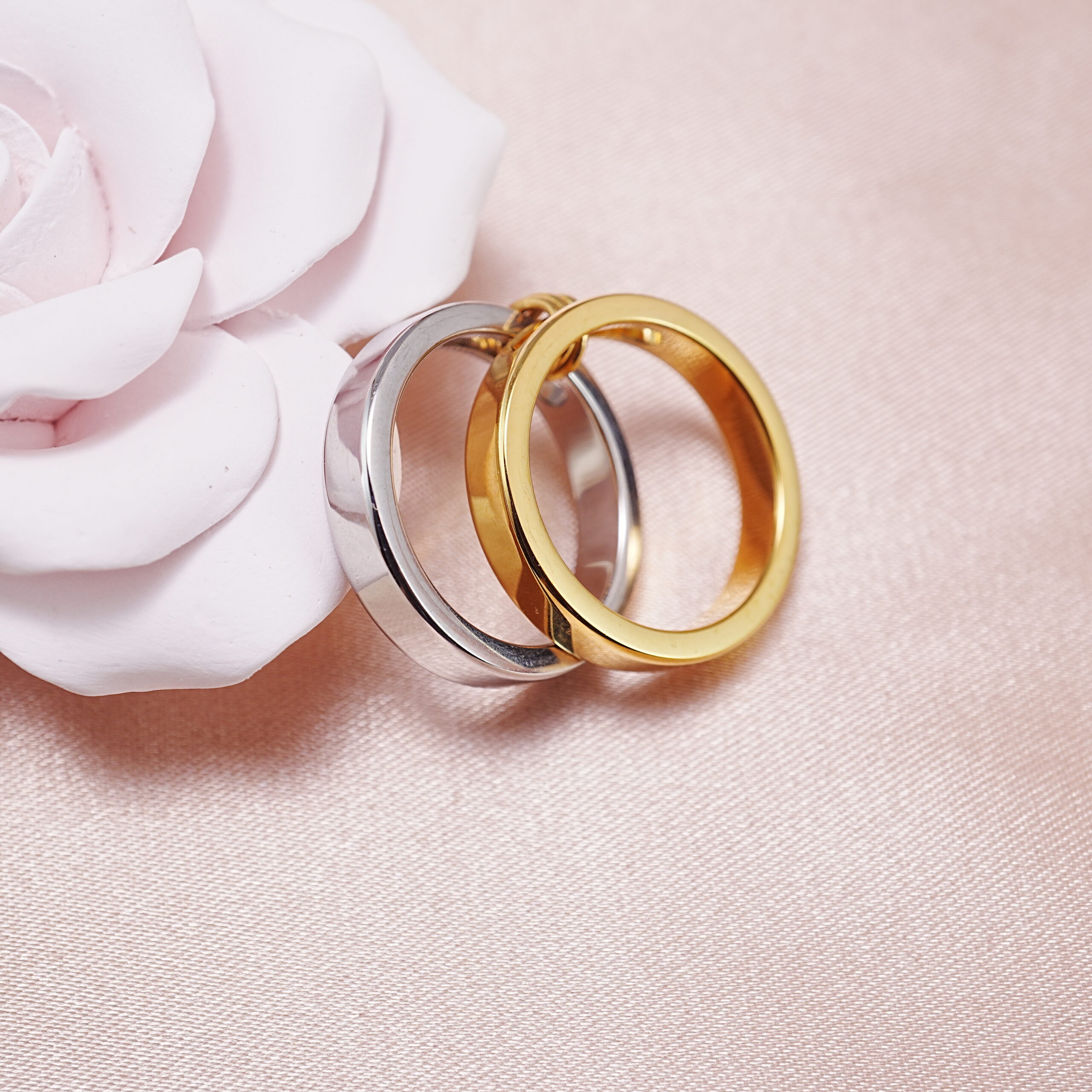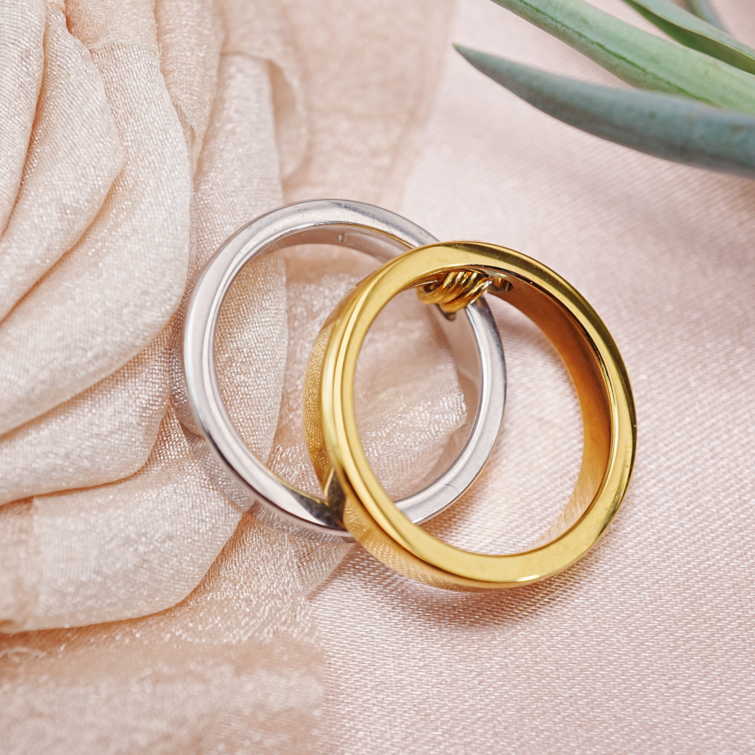 A modern set of two-tone stainless steel stacking rings — versatile, lightweight, and perfect for mixing, matching, and creating stylish stacked ring looks while adding a clean contemporary touch to any outfit.